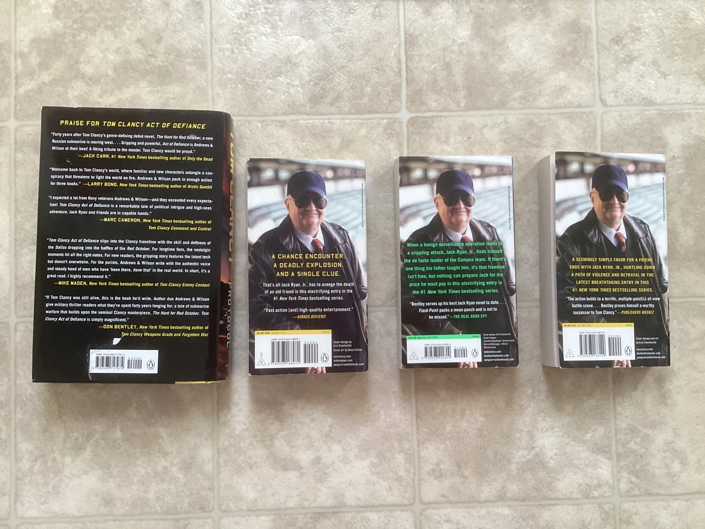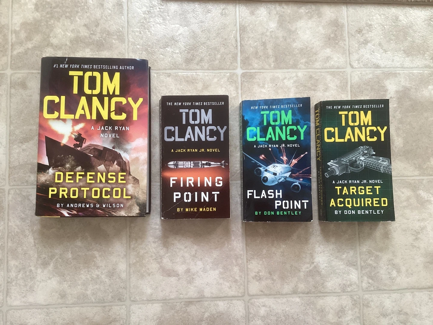 This is a set of 4 Tom Clancy Jack Ryan Jr. novels. Titles include Defense Protocol, Firing Point, Flash Point, and Target Acquired. They're all paperback books by New York Times bestselling authors. Sfor home. Pick up near Scarborough UofT campus (Conlins and Ellesmere)