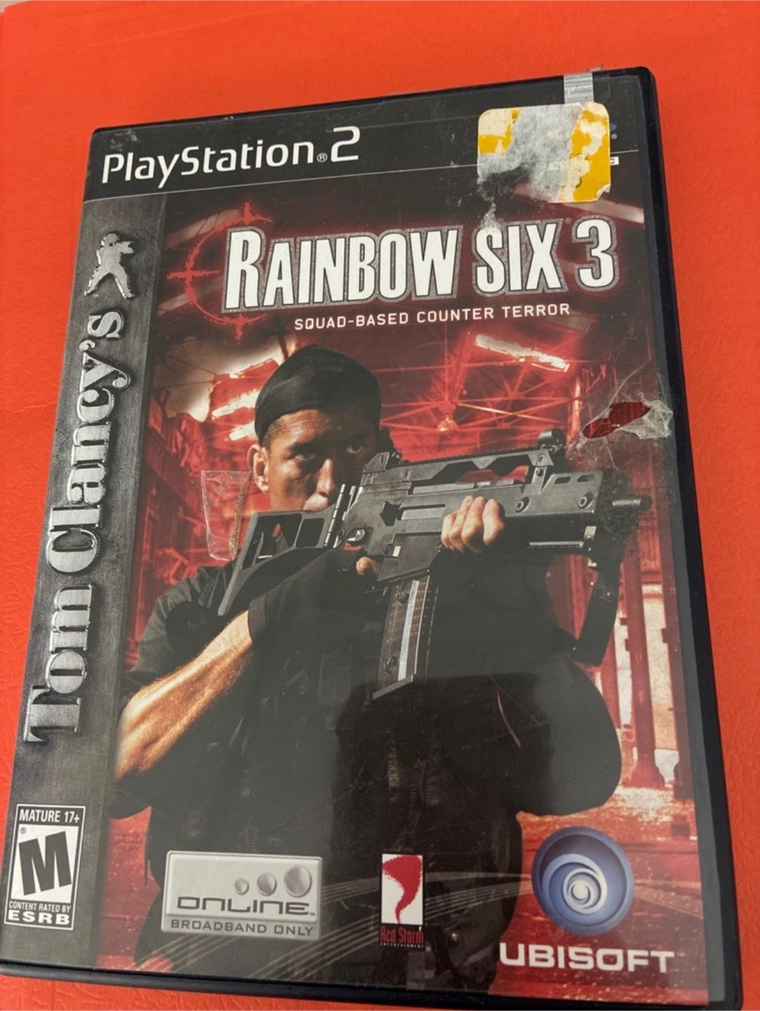This is Tom Clancy's Rainbow Six 3 for PlayStation 2. It's a squad-based counter-terror game with online broadband play. The ESRB rating is Mature 17+.