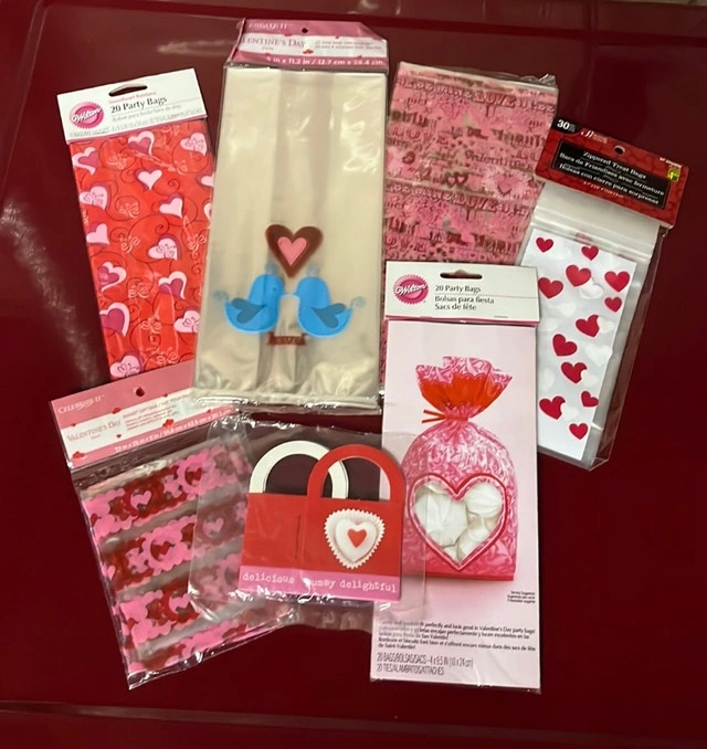 Heart-themed treat and gift bags. Most are new, sealed. Includes a new 20-pk Wilton red with pink hearts party bags, new Celebrate It clear with blue birds and heart treat bags, open package treat bags with words like love and valentine, new 30-pk zippered treat bags with red hearts, new Celebrate It basket gift bag, an open package with 2 paper treat baskets, and new 20-pk Wilton party bags with a clear heart window. Great for holding candy, treats, and gifts for Valentine’s day, weddings, bridal showers, anniversary parties, birthdays, and more. Selling as one group of 7 packages. $10. Located near the Burlington/Oakville border.
