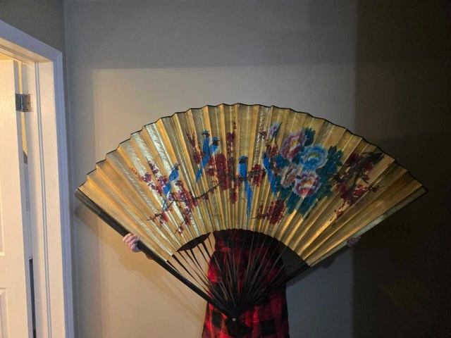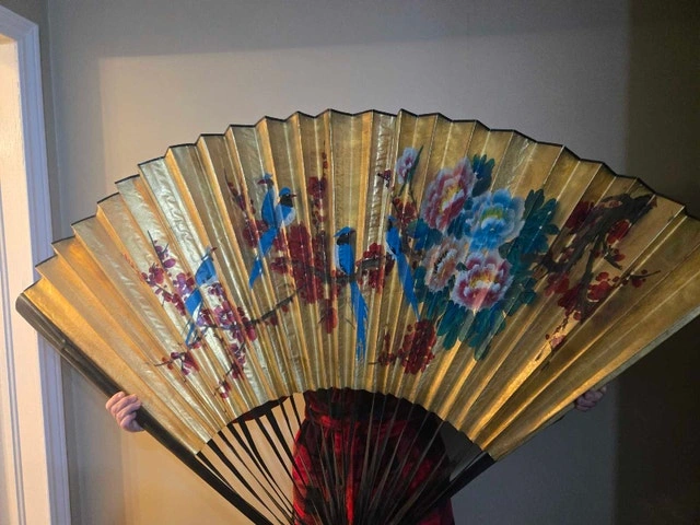 Beautiful large Asian wall art fan with a shiny gold background, featuring pretty blue birds and colorful flowers. A great piece for wall decor that adds a nice touch to any room. Measures 60x40. Pick up in Welland. $125 or best offer. If the ad is still up, it's still available!