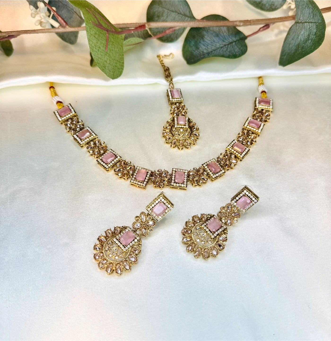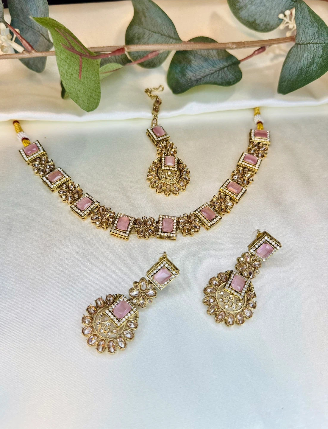 This is a beautiful three-piece jewellery set. It includes a necklace, a pair of earrings, and a tikka. The set features pink square stones and intricate gold-tone detailing with clear embellishments.