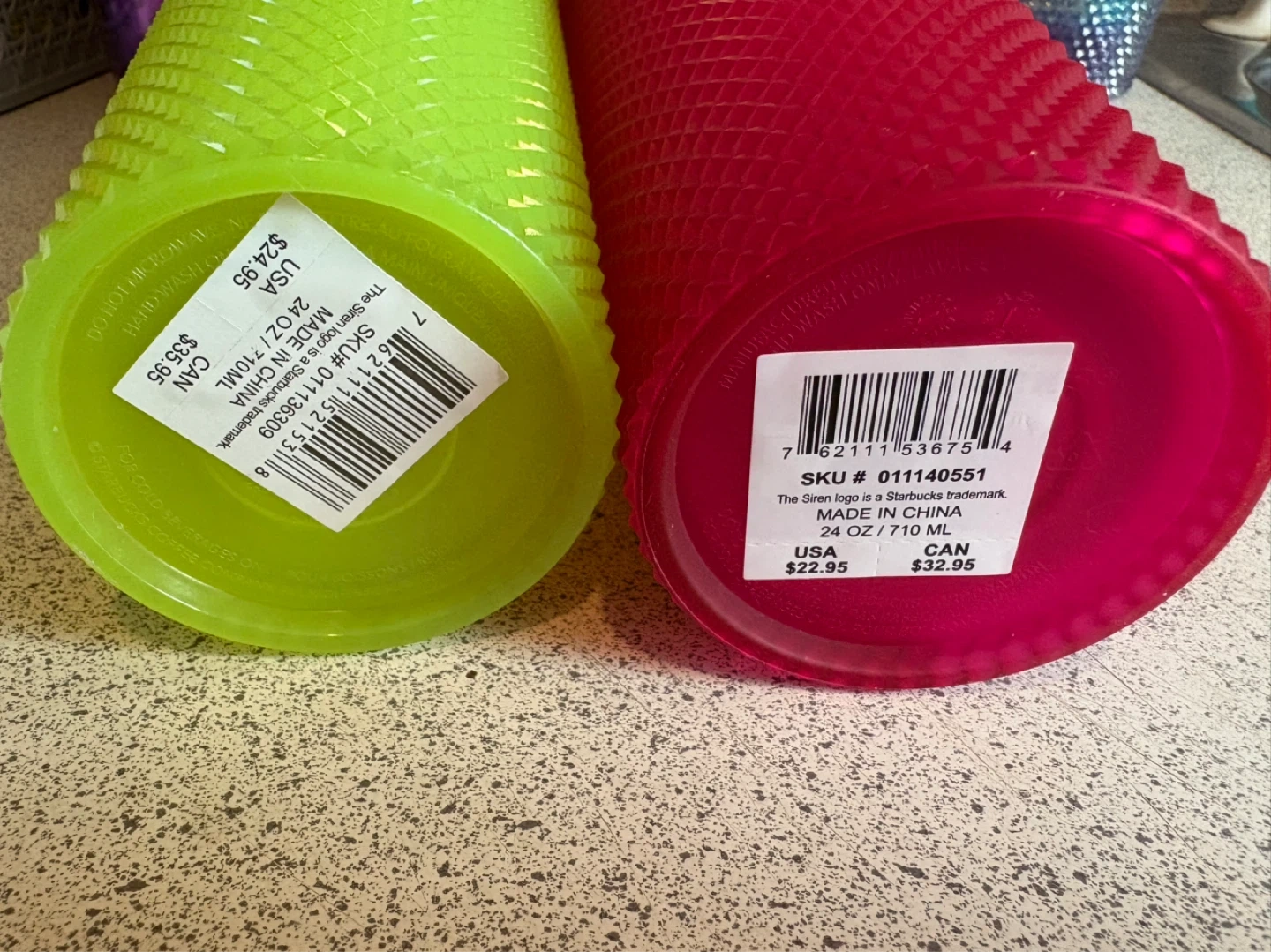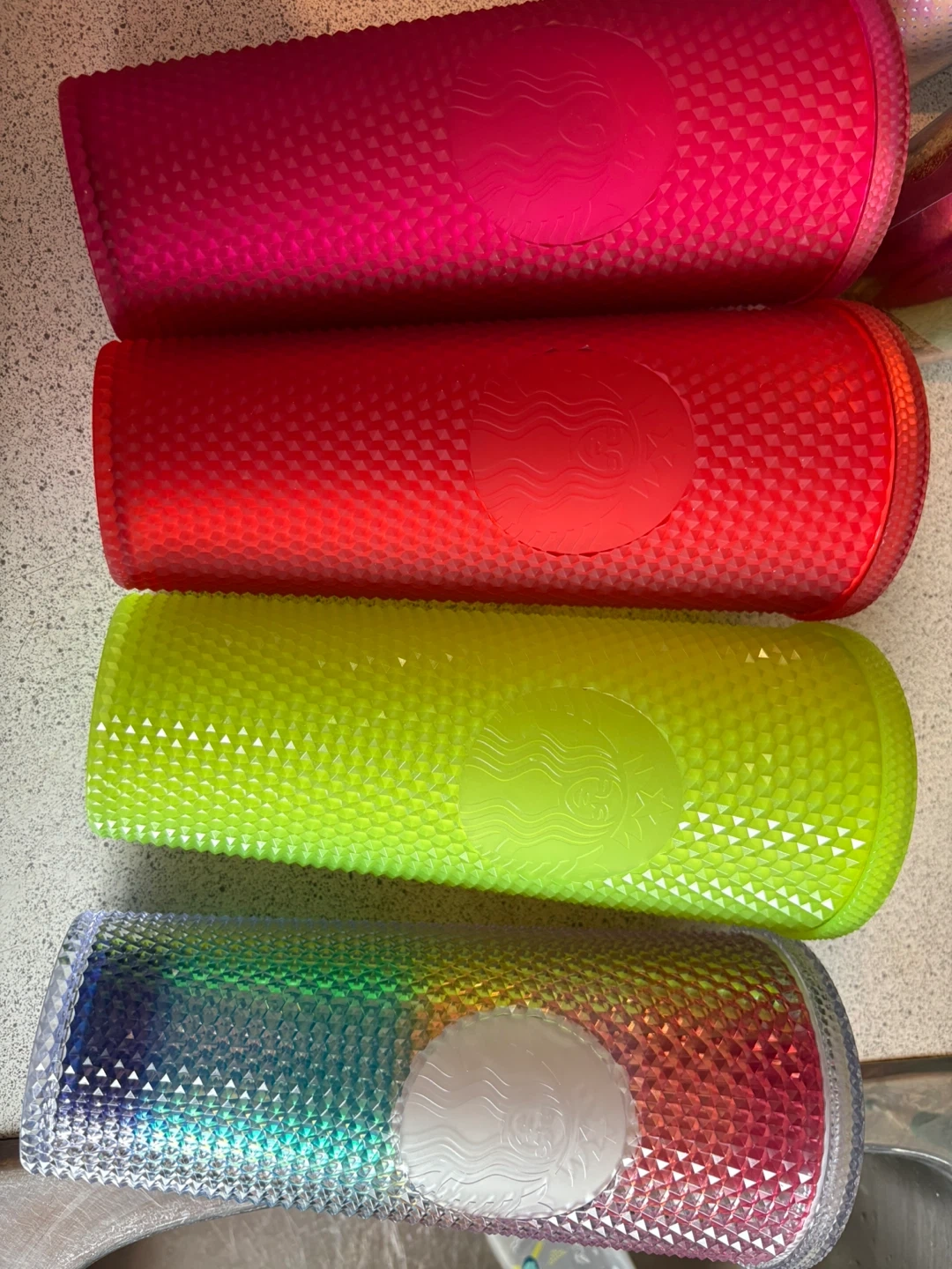 Set of four Starbucks studded tumblers, each holding 24 oz or 710 ml. Colours include bright pink, red, lime green glows in the dark , and a rainbow gradient. Hand wash only.