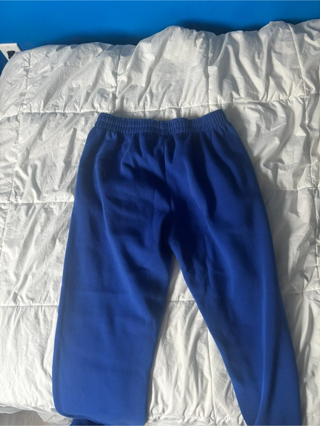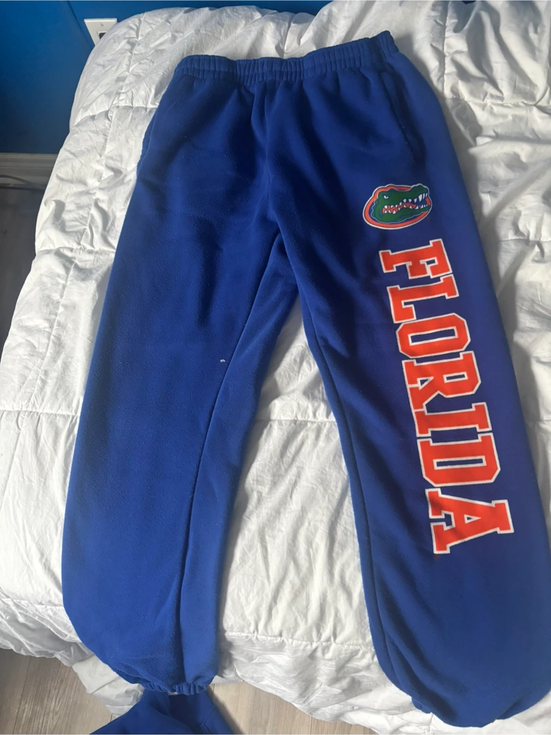 Royal blue sweatpants with the Florida Gators logo and 'Florida' text graphic. Comfortable fleece material. Elastic waistband and cuffs.
