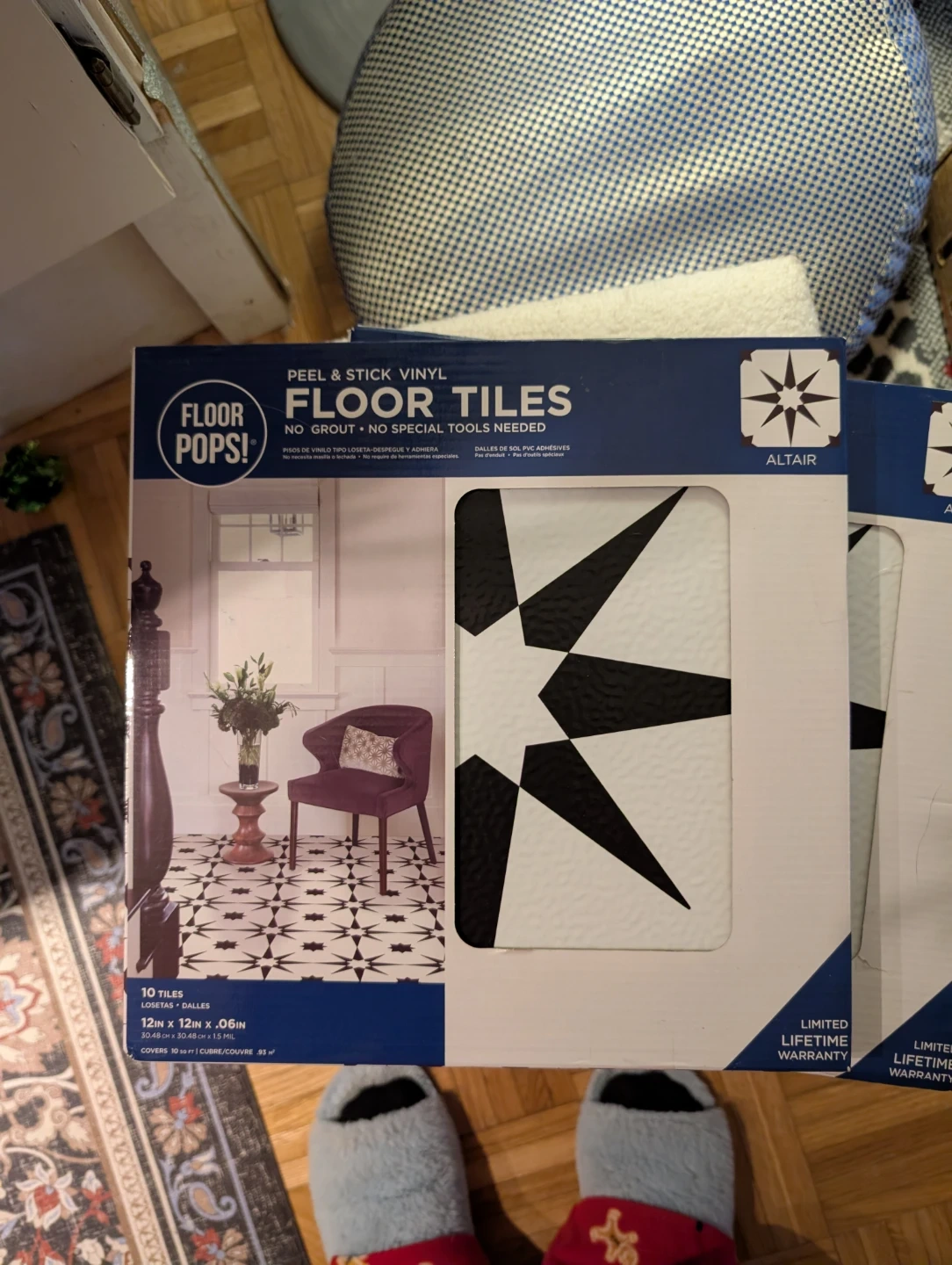 2 pack of 10 tiles of peel and stick vinyl floor tiles in the Altair design. Each tile is 12"x12" and 0.06" thick. No grout or special tools are needed for installation!
