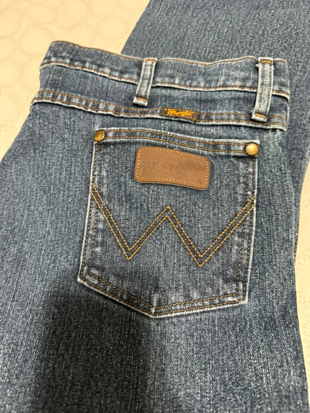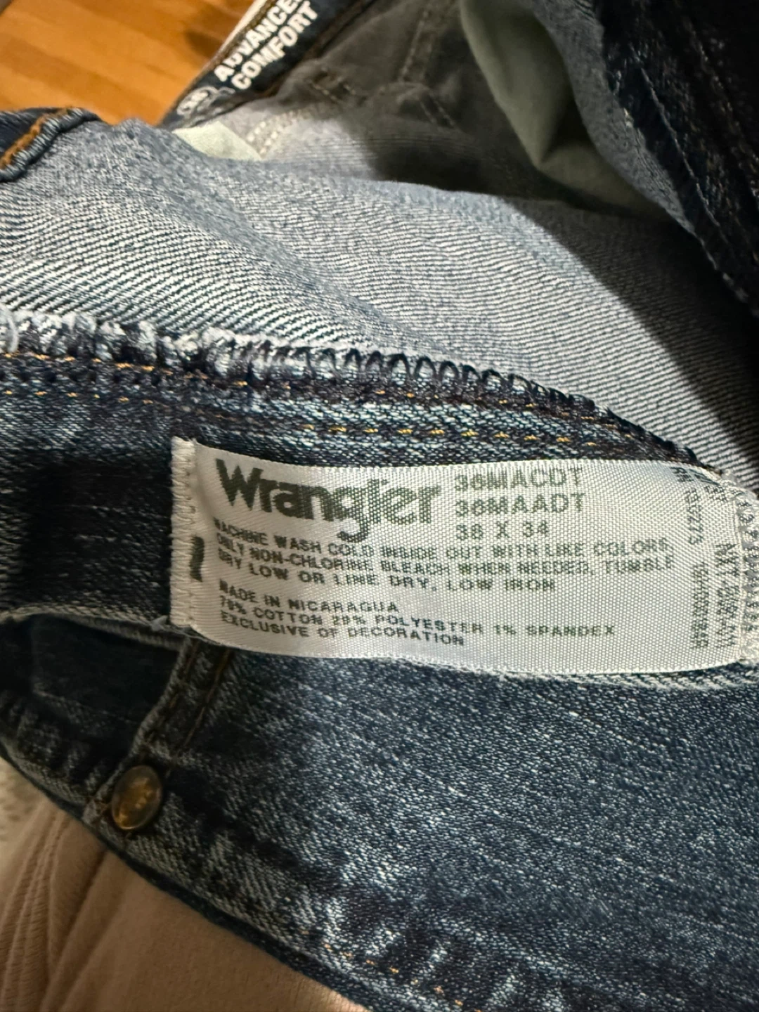 Selling a pair of Wrangler Advanced Comfort jeans in size 38x34. They are made of 79% cotton, 20% polyester, and 1% spandex. Comfortable and durable!