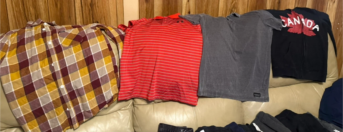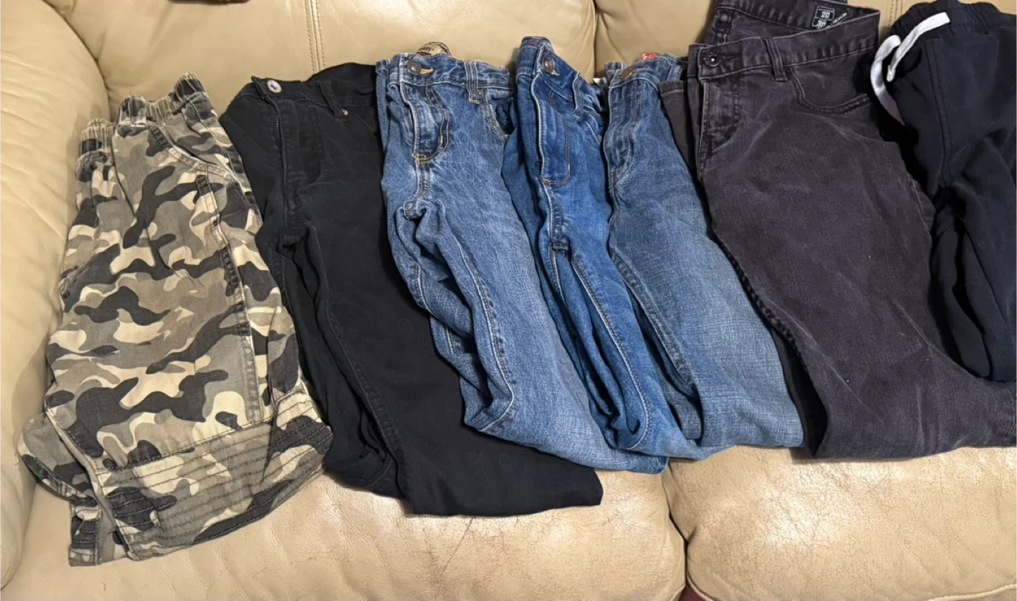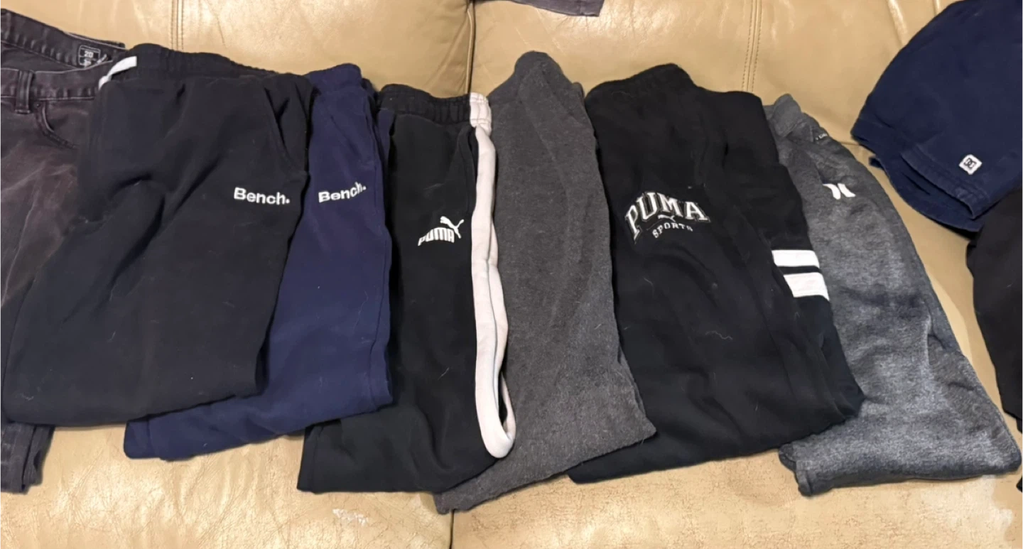 5 pairs of jeans, 2 pairs of pants, 6 pairs of sweatpants, 3 pairs of shorts, 3 sweaters, 5 long sleeved shirts, 4 T-shirts, 2 tank tops, 2 short sleeved dress tops and 1 sweater jacket.