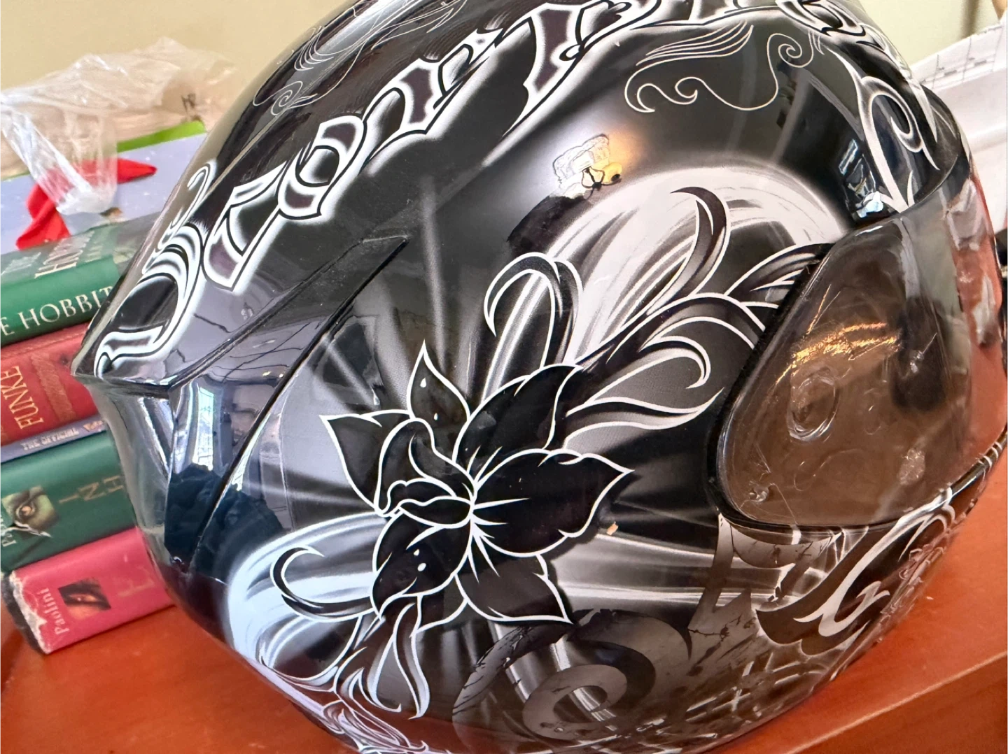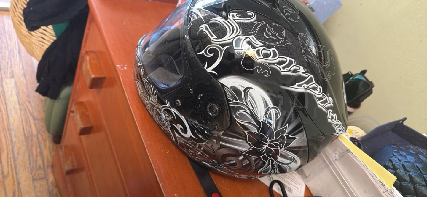 This Scorpion EXO-R410 helmet features a black shell with a white and grey floral design. It meets Snell 2010 and DOT standards. It's a full-face helmet for riders. Size small 55-56cm.