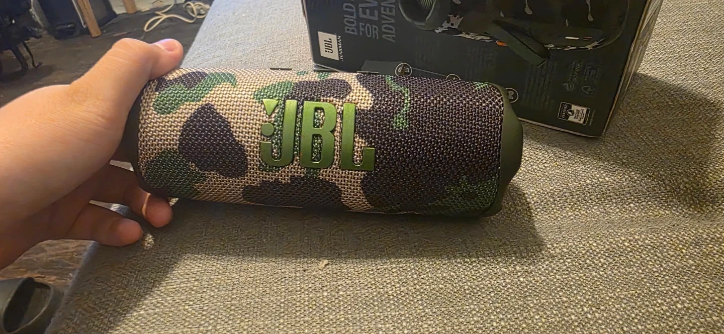 JBL Flip 7 portable speaker in a cool camouflage design. It's water-resistant and offers bold sound for any adventure. Bluetooth connectivity.