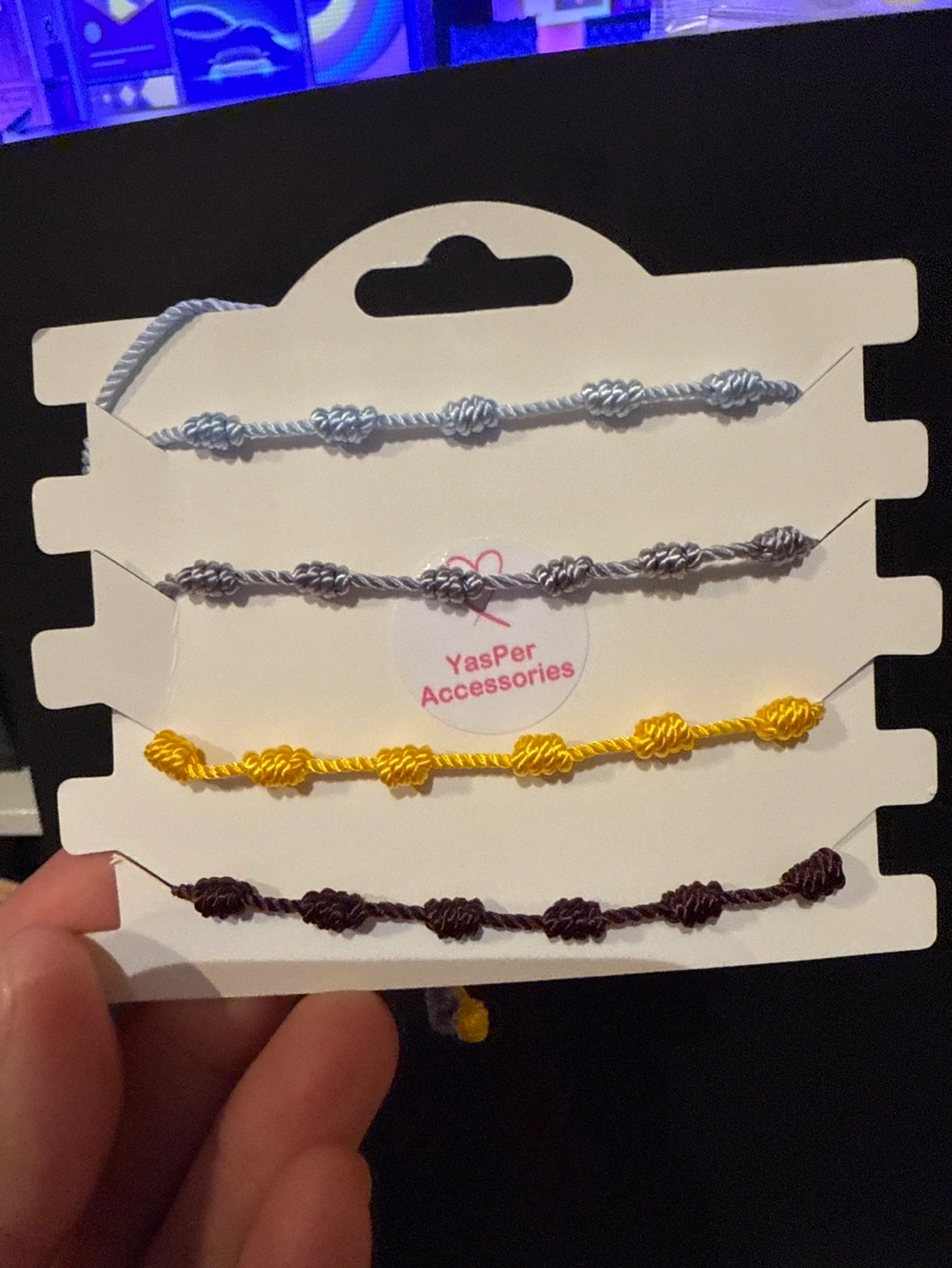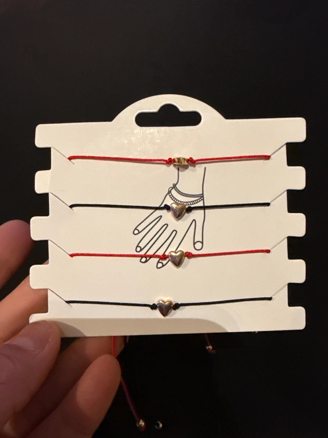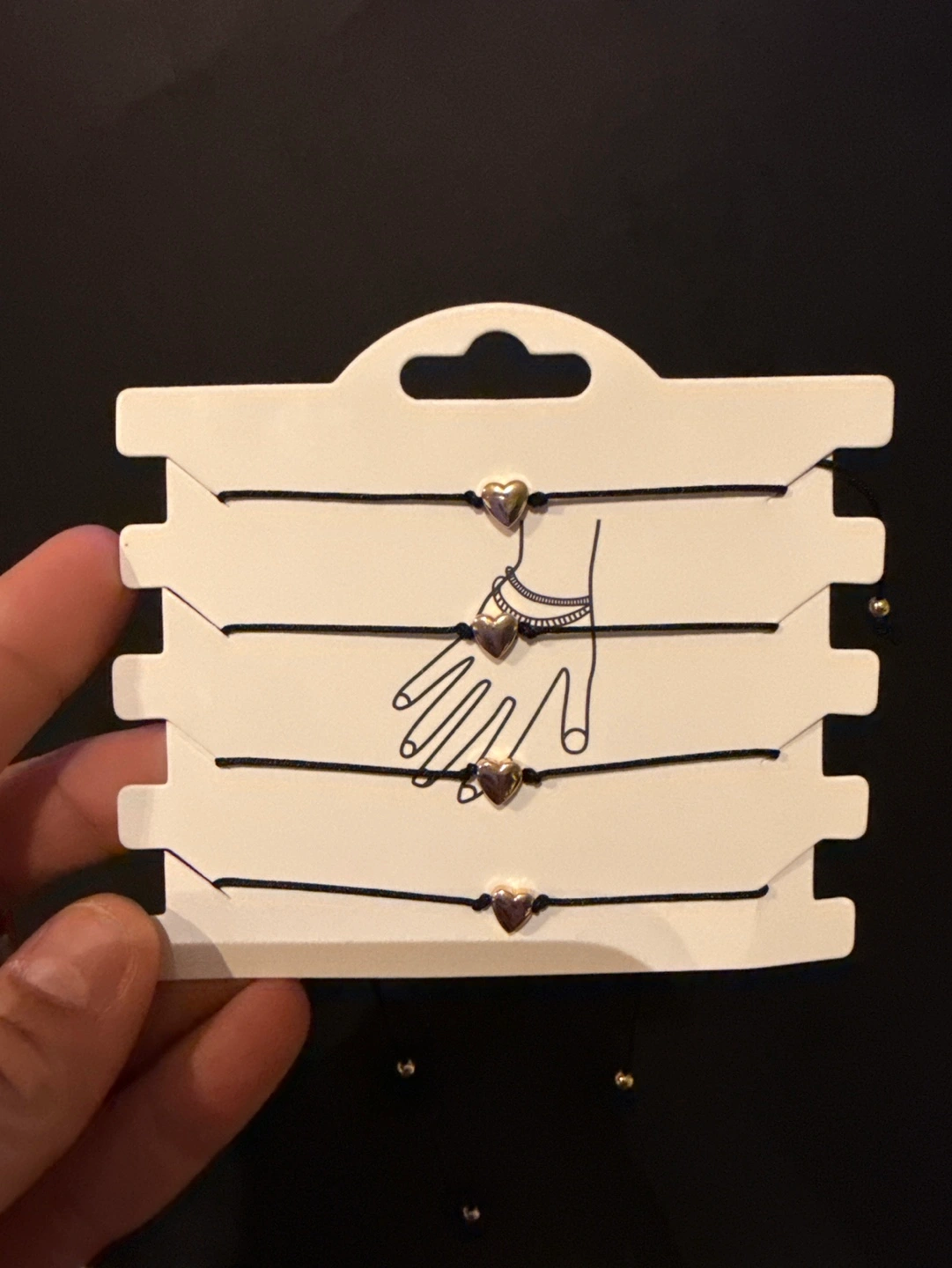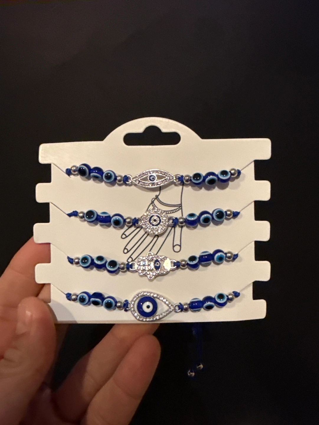 Four adjustable bracelets. Each features small turquoise or blue evil eye beads and a unique charm. Great for layering or gifting.