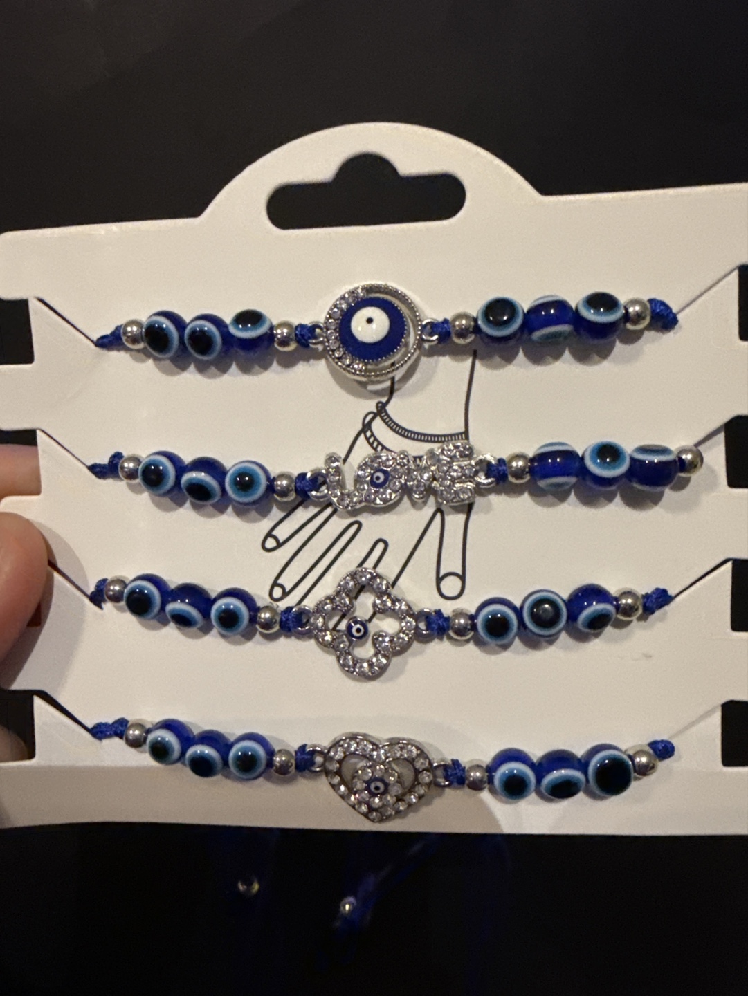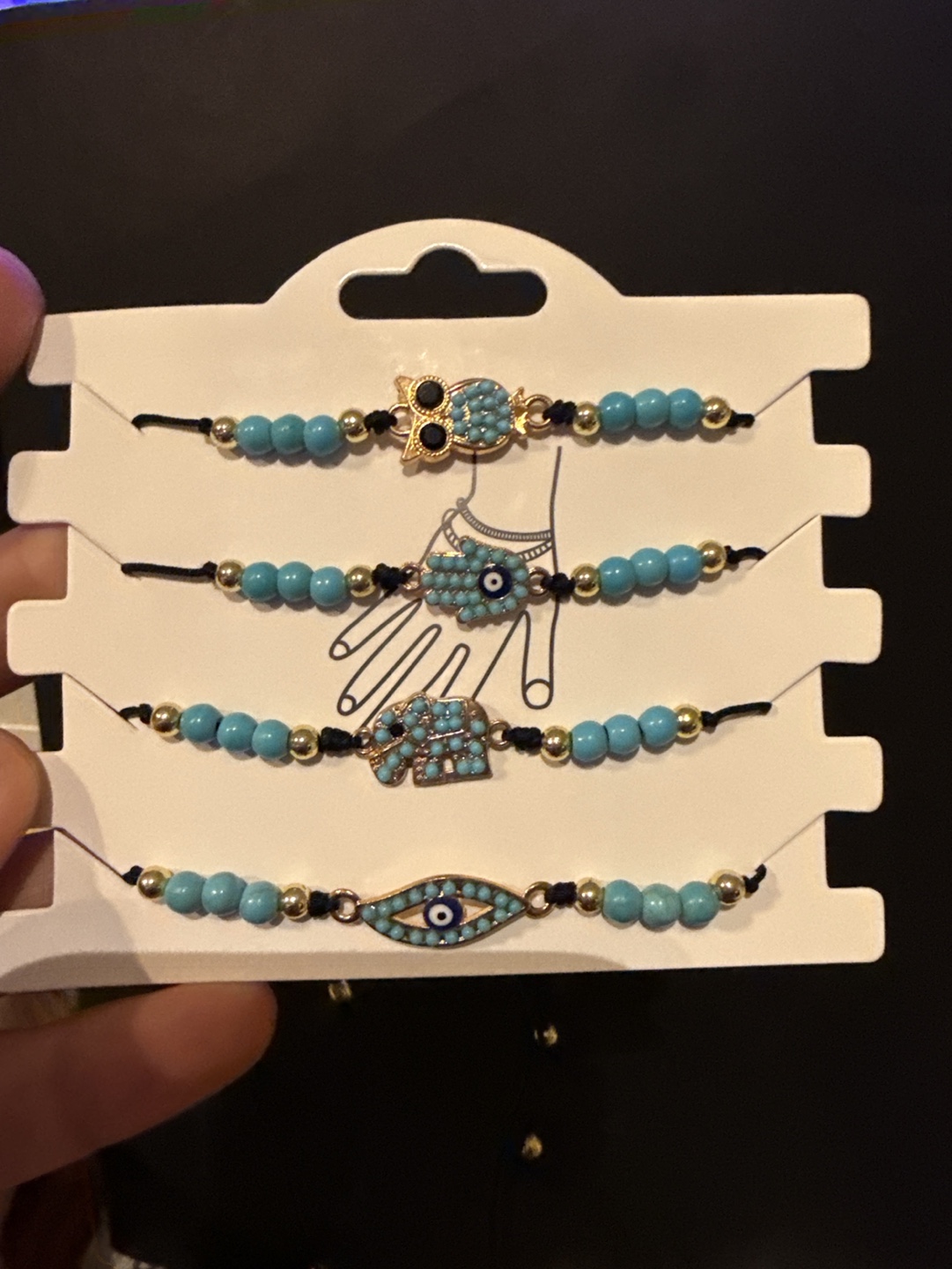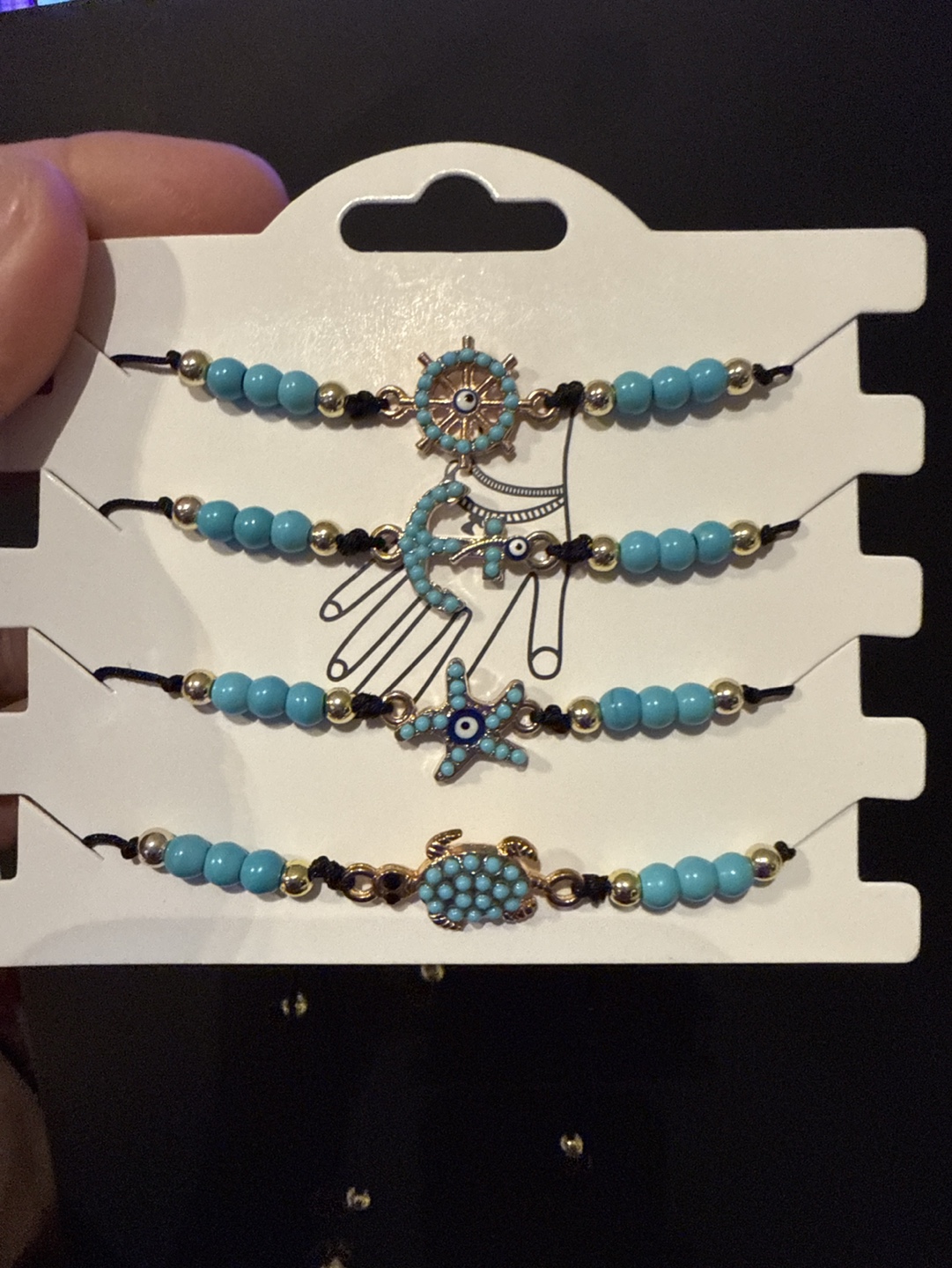 Four adjustable bracelets. Each features small turquoise or blue evil eye beads and a unique charm. Great for layering or gifting.