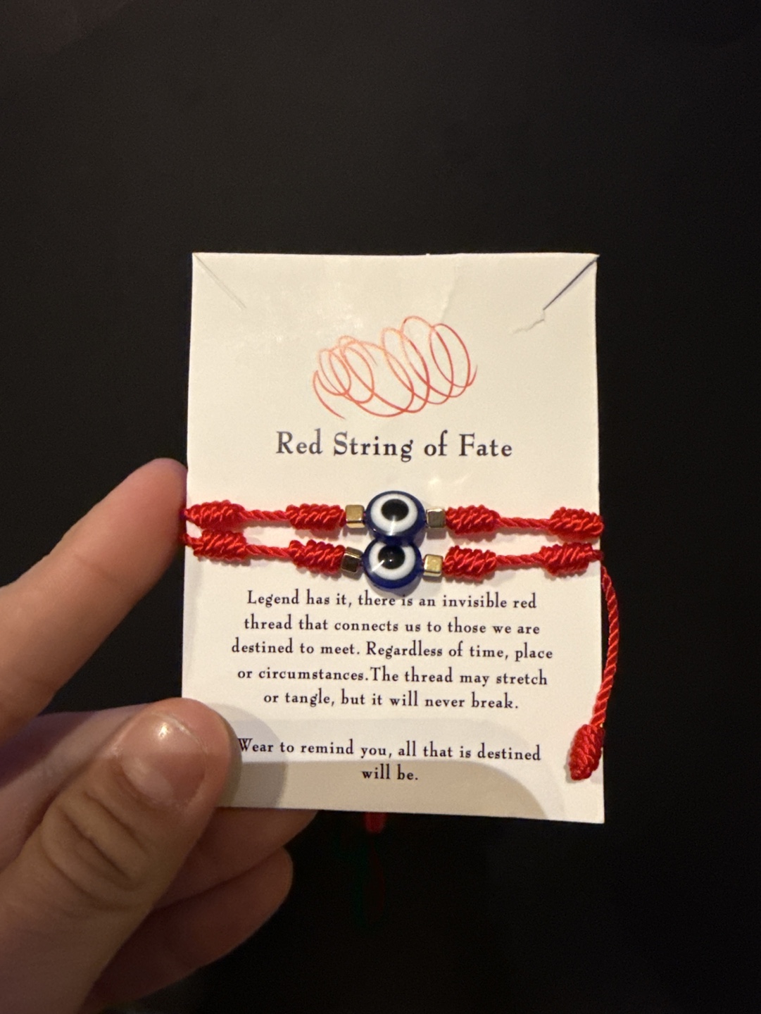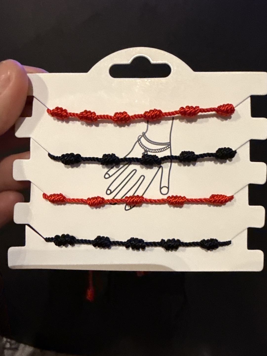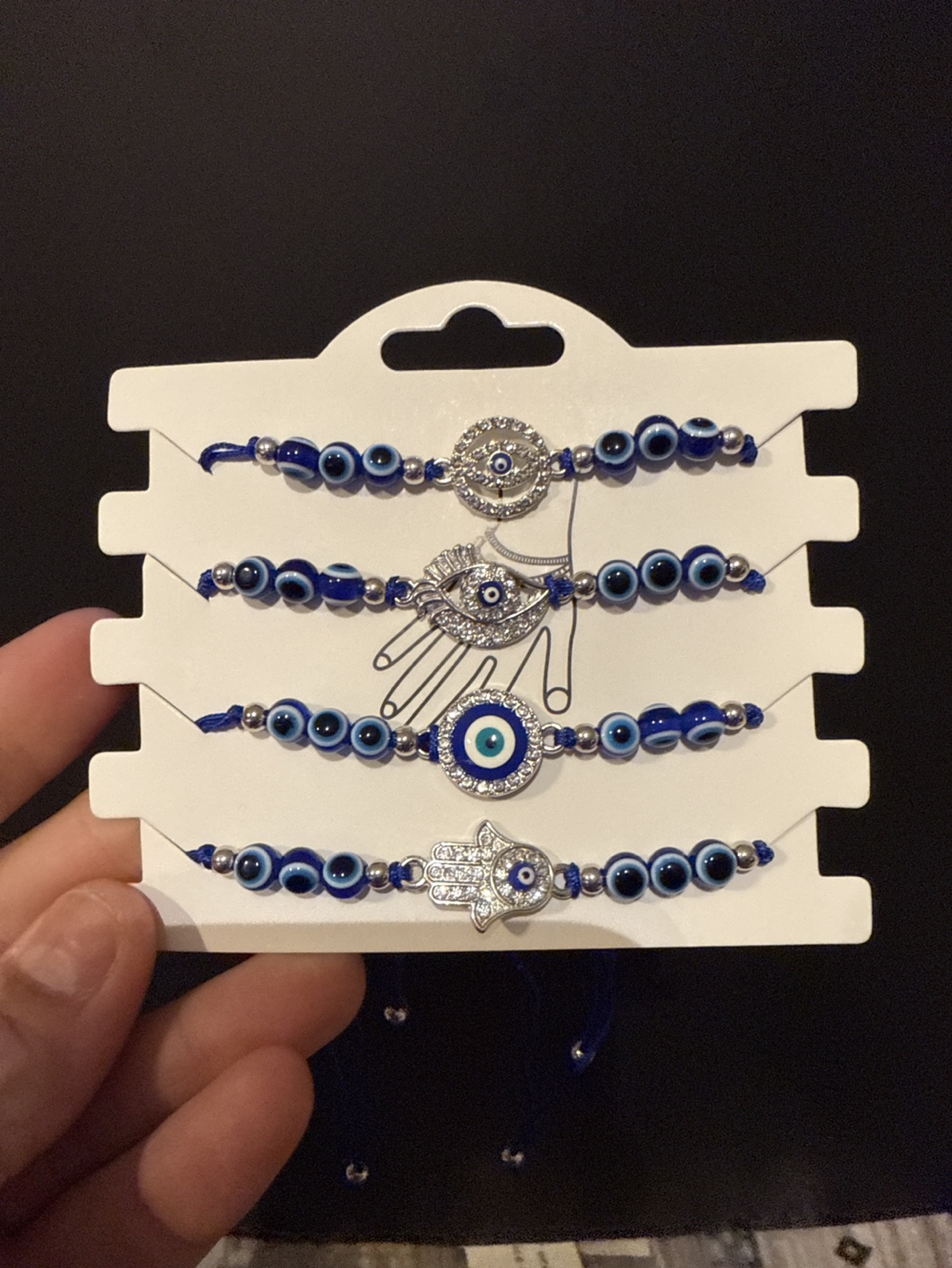 Four adjustable bracelets. Each features small turquoise or blue evil eye beads and a unique charm. Great for layering or gifting.