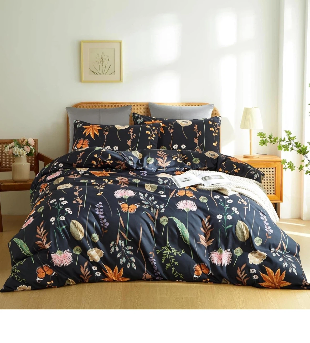This duvet cover set features a dark navy background with a vibrant botanical and butterfly print. It's made from a soft material for comfortable sleep. This bedding set would be a lovely addition to any bedroom!