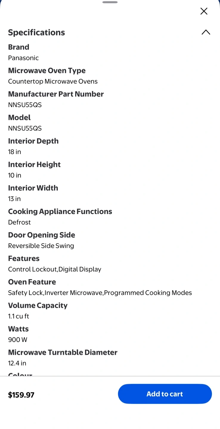 This compact Panasonic microwave oven is the perfect size for apartment or condo living. Auto Cook and Auto Defrost features take the guess work out of cooking. Simply select one of 7 cooking programs to automatically cook your favourite dish. The 4 Digit white LED display is clear and easy to read while the stainless steel design compliments any kitchen and the grey interior is easy to clean.