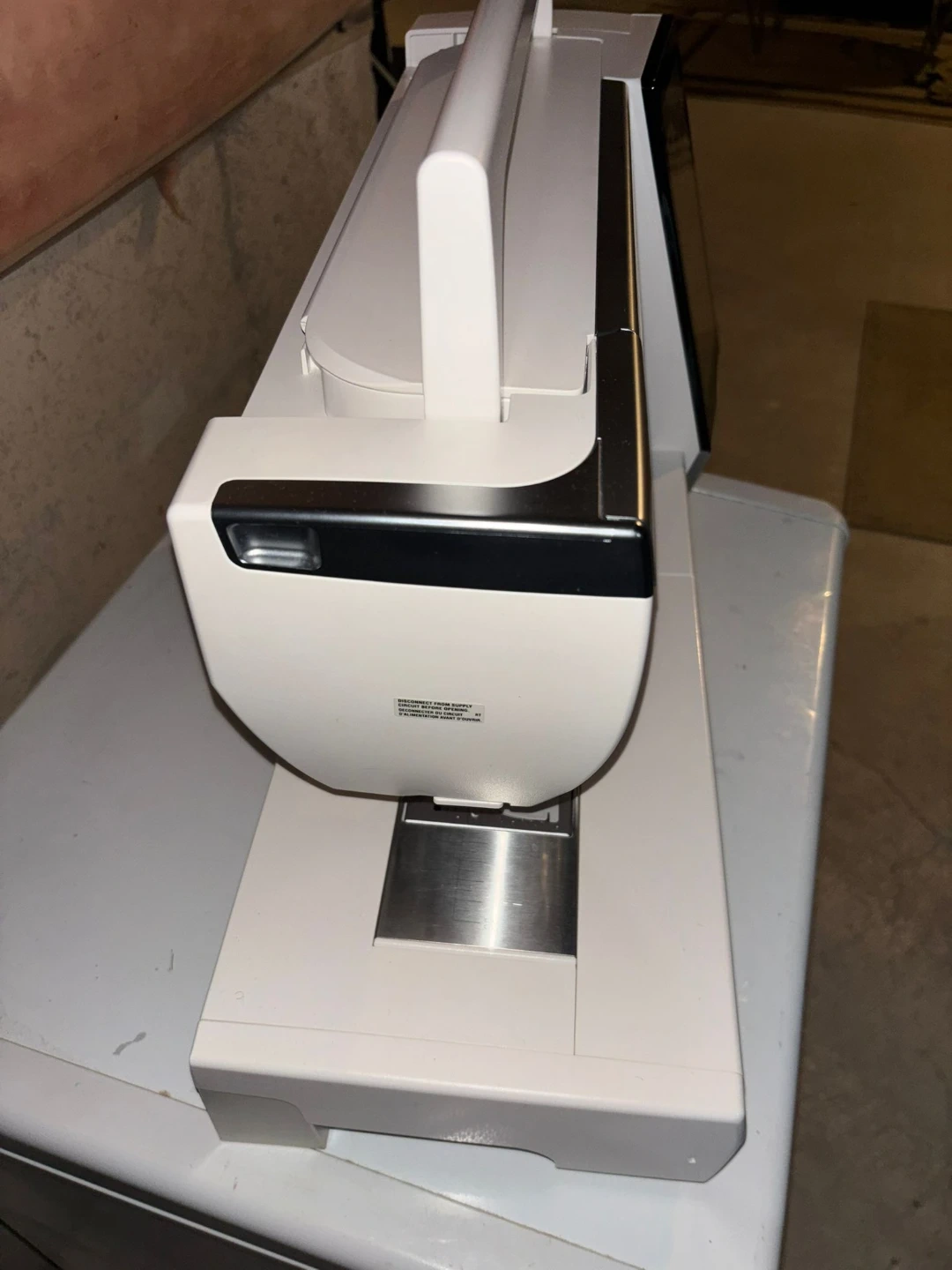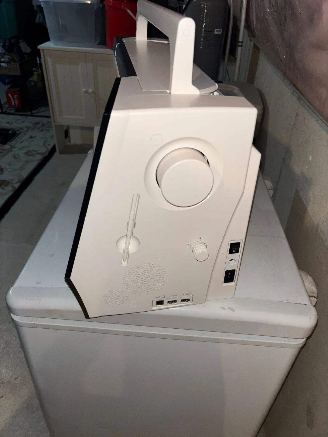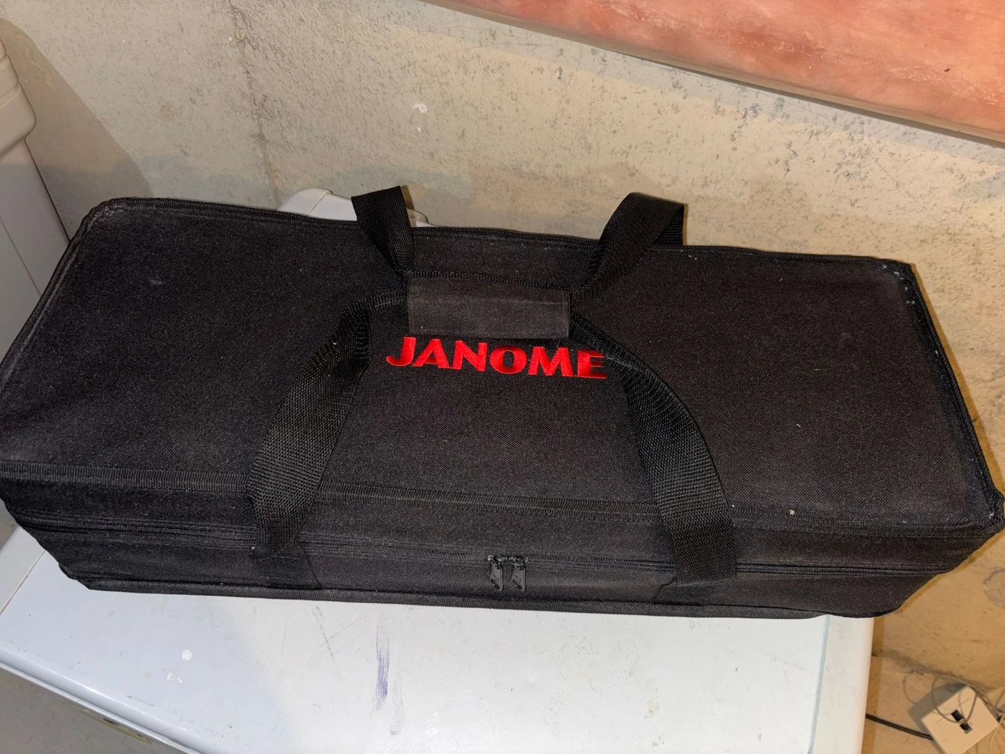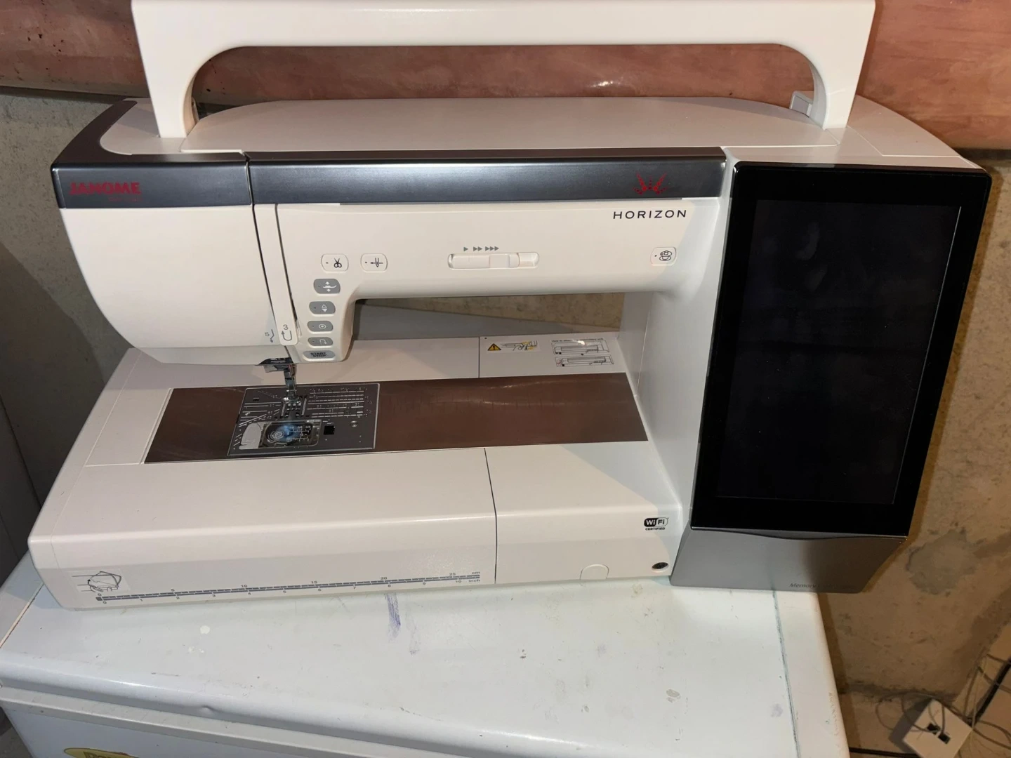 This is a Janome Horizon sewing machine. It features a touchscreen interface and Wi-Fi connectivity. Comes with a carrying bag.