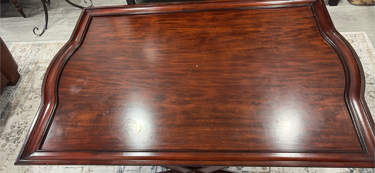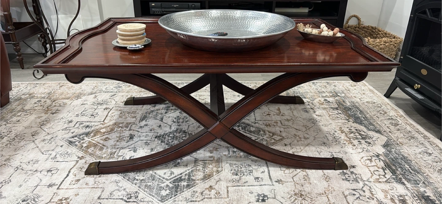 This elegant tray table features a rich mahogany finish and a classic X-base design. Its surface is smooth and showcases the natural wood grain. Perfect for serving drinks or displaying decor.