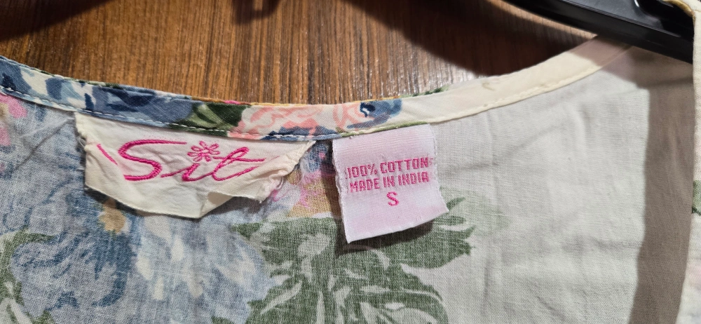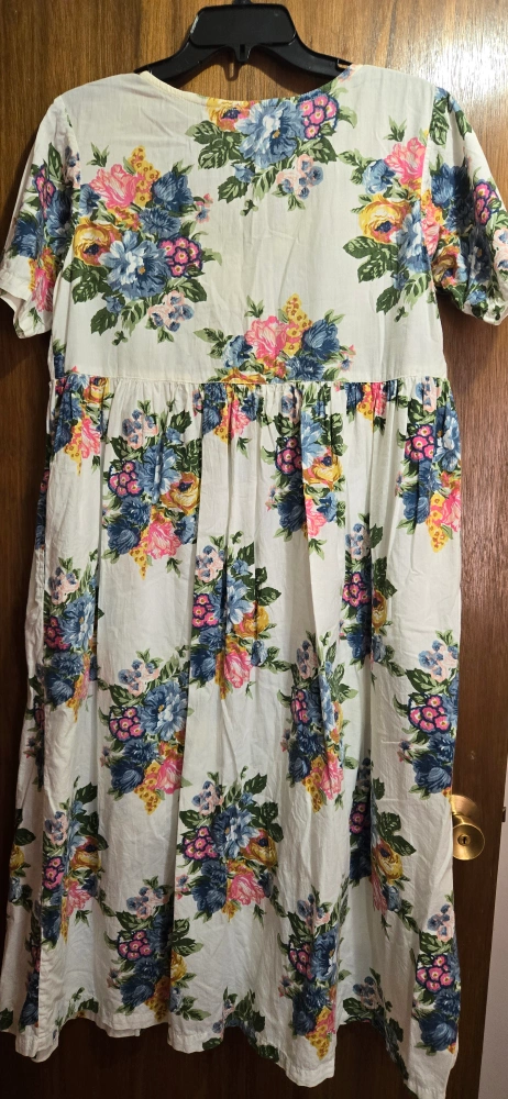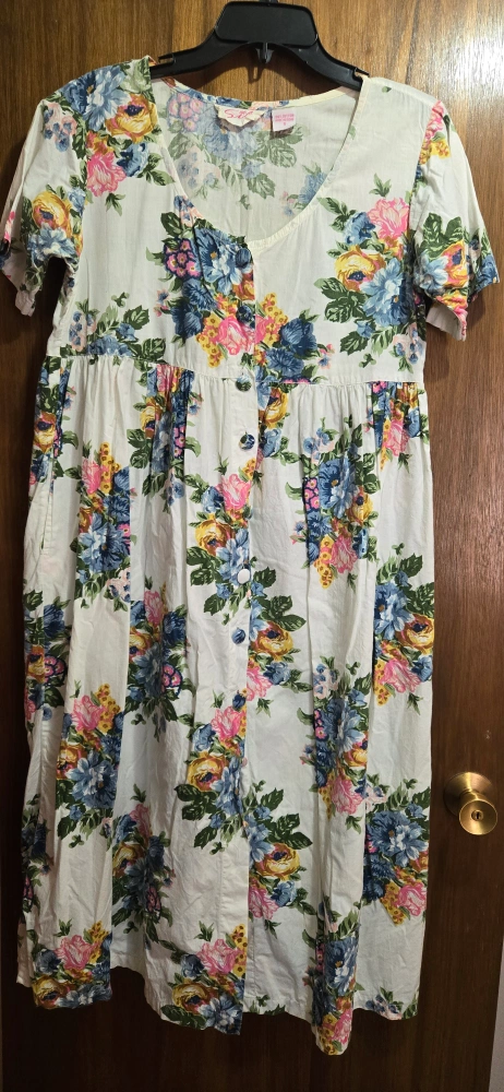 Size S, white cotton dress with floral pattern and short sleeves. It has a button up front. Empire waist.