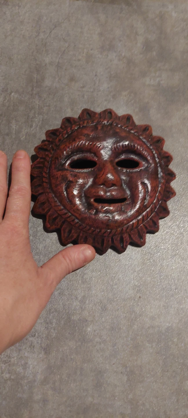 This is a decorative wall mask featuring a sun face design. It's made of a reddish-brown clay with a textured finish. The mask has a friendly expression and can add a unique touch to home decor.