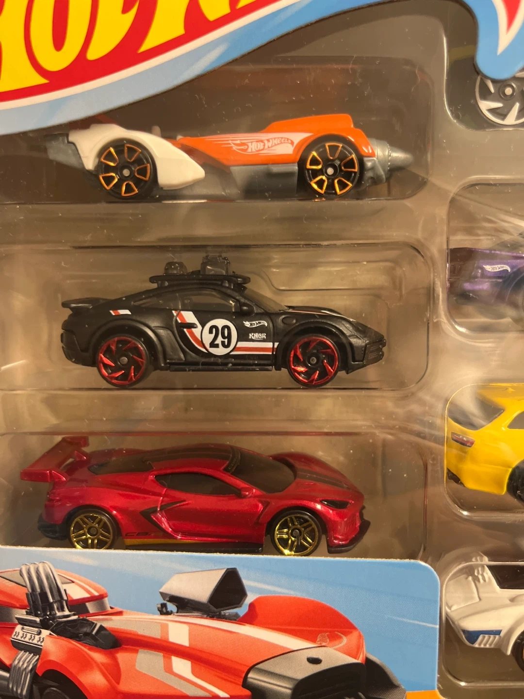 This is a new Hot Wheels 10 car pack. It includes a variety of colourful toy cars. These cars are recommended for ages 3 and up.