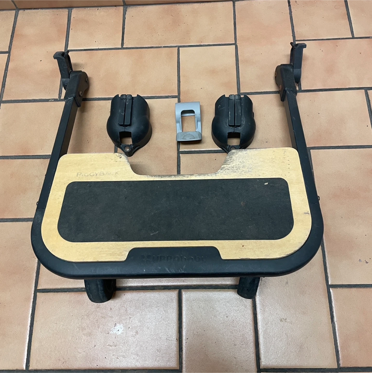 This is an UPPAbaby Piggy Back ride-on board. It includes two connectors and a grey bracket. The board has a wooden base with a black anti-slip mat. It's designed for children to stand on while attached to a stroller. Include replacement latch.