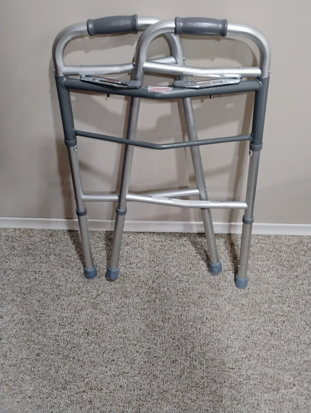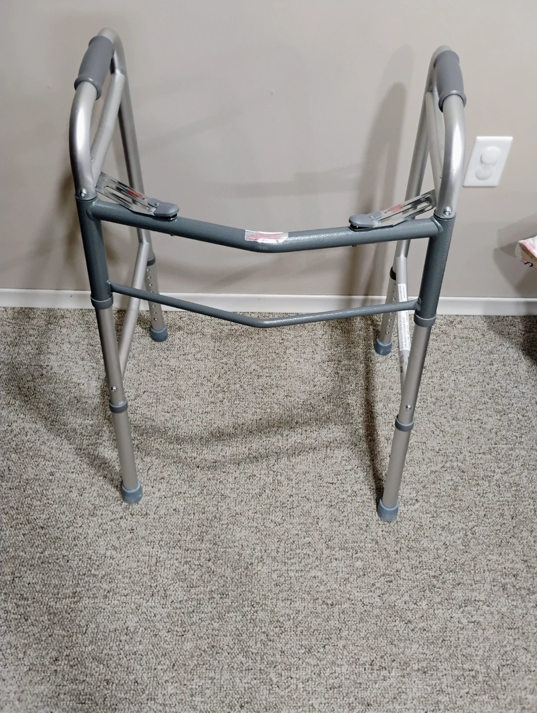 This is a lightweight folding walker, constructed from durable aluminum. It features adjustable height settings, indicated by the visible adjustment holes. The handles are grey and ergonomic. It folds flat for easy storage and transport. This walker is suitable for individuals needing stability and support.