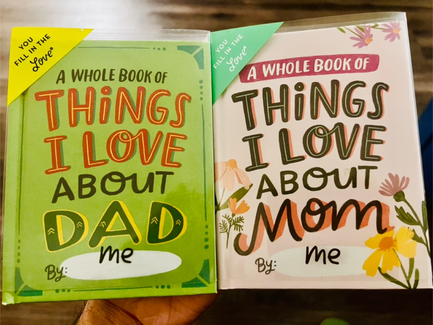 Two "Fill In The Love" books, one for Dad and one for Mom. Each book is a unique, personalized gift. Instructions include washing hands and thinking of moments to fill in the blanks. Prepare for hugs and exclamations of appreciation!