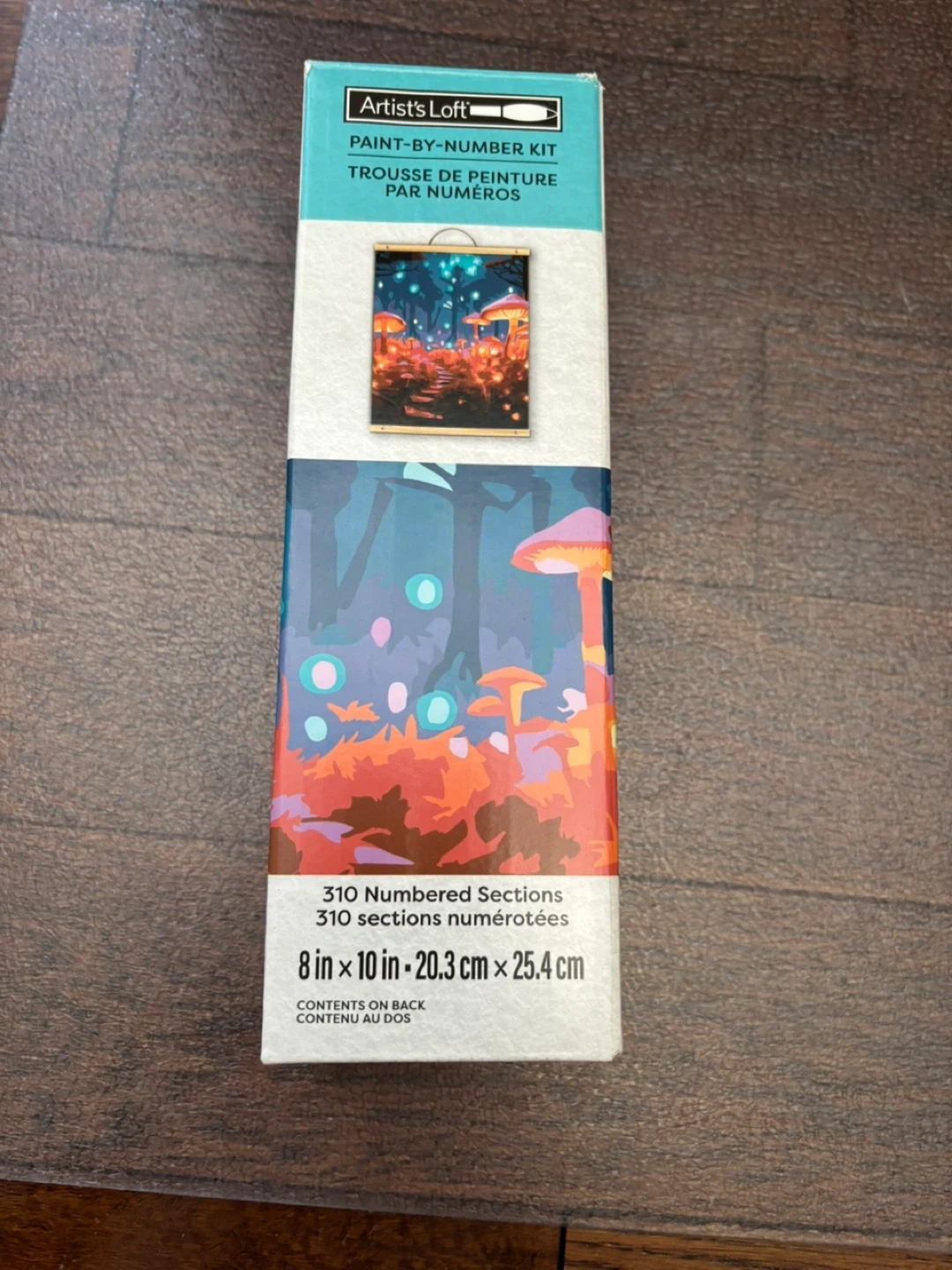 This Artist's Loft paint-by-number kit includes 310 numbered sections. It measures 8 inches by 10 inches, which is 20.3 cm by 25.4 cm. This kit is great for anyone who enjoys a creative challenge!