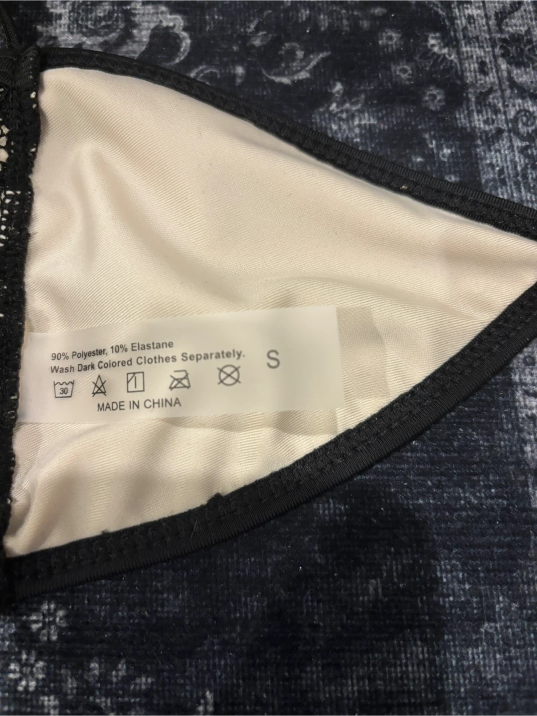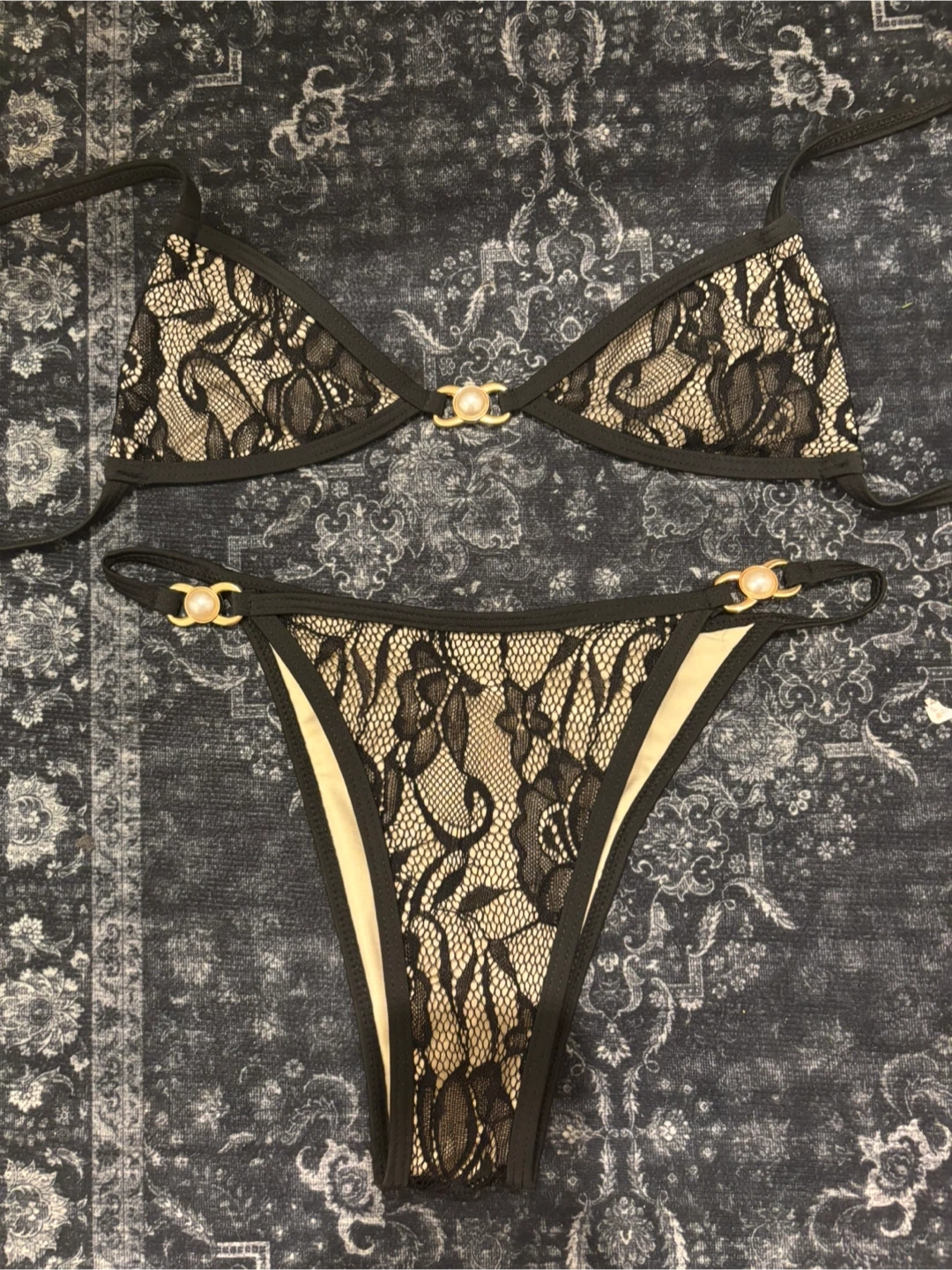 This brand new black lace bikini set features a stylish design. It's made with 90% polyester and 10% elastane. Machine wash cold, gentle cycle, and wash dark colours separately.