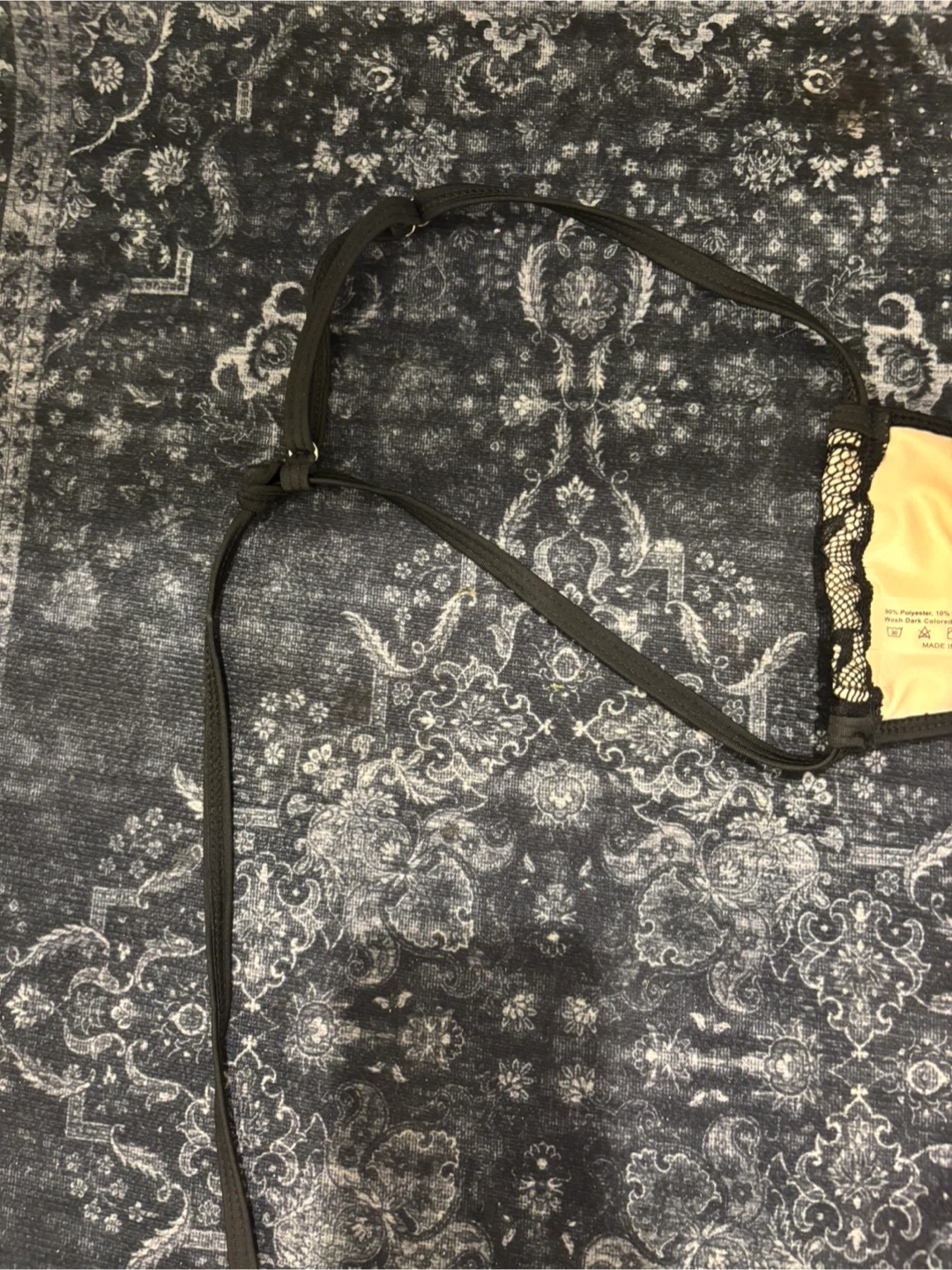This brand new black lace bikini set features a stylish design. It's made with 90% polyester and 10% elastane. Machine wash cold, gentle cycle, and wash dark colours separately.