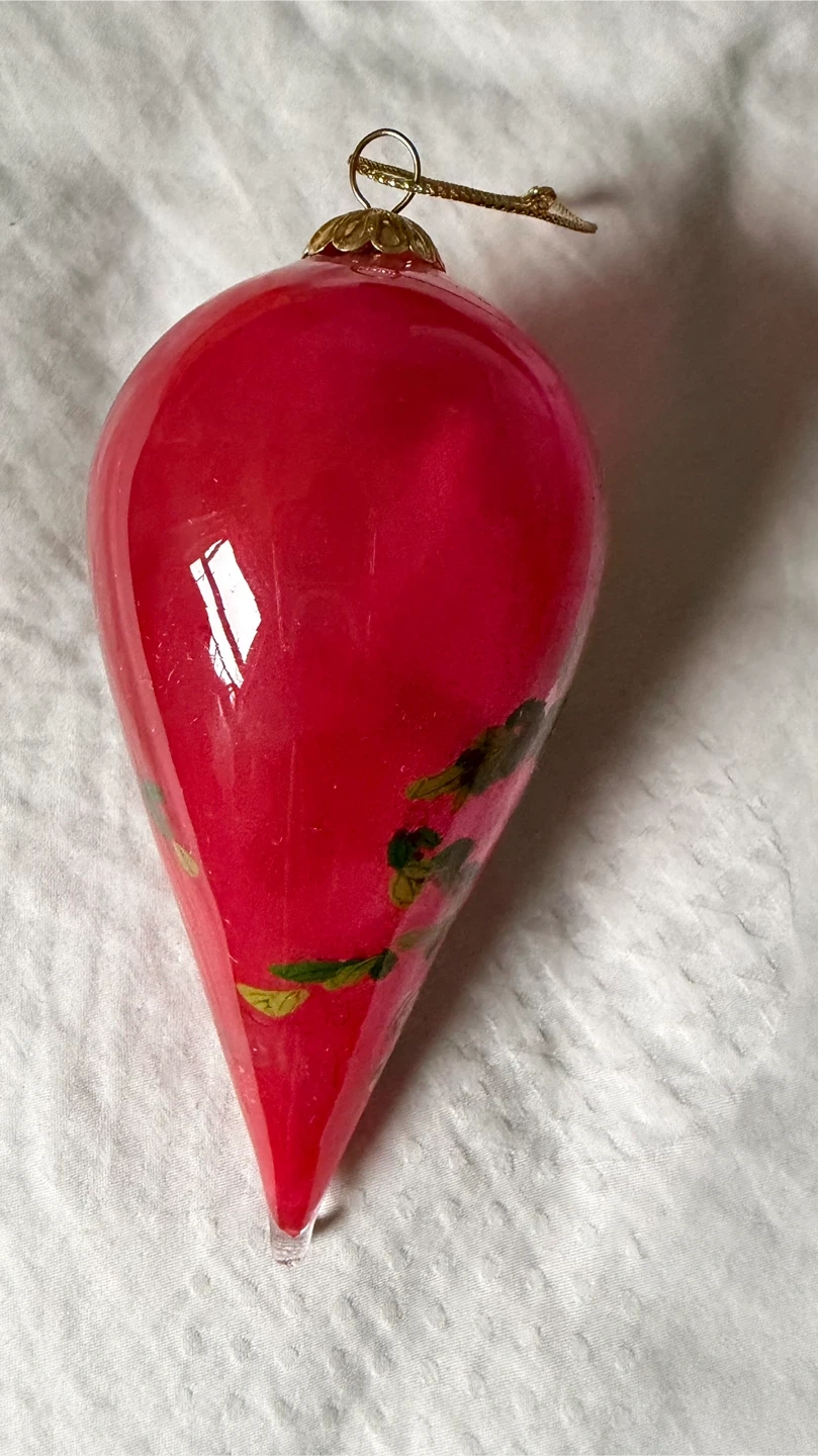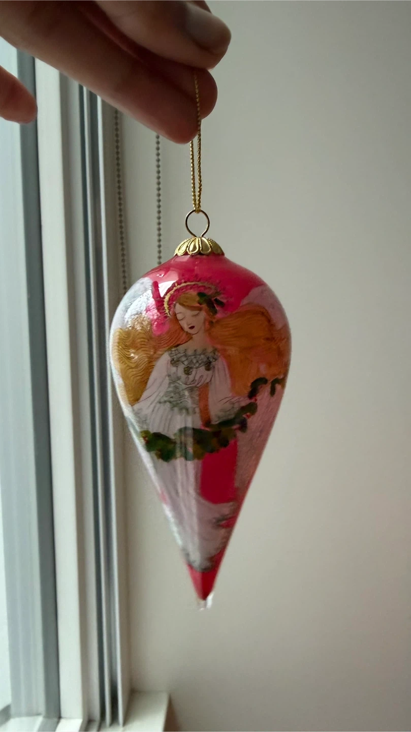 This is a beautiful tear drop shaped Christmas ornament. It features an angelic figure with long blonde hair and a wreath. The ornament is primarily red with some white and pink accents. It has a gold coloured cap with a hanging loop. This ornament would add a lovely touch to any holiday tree!