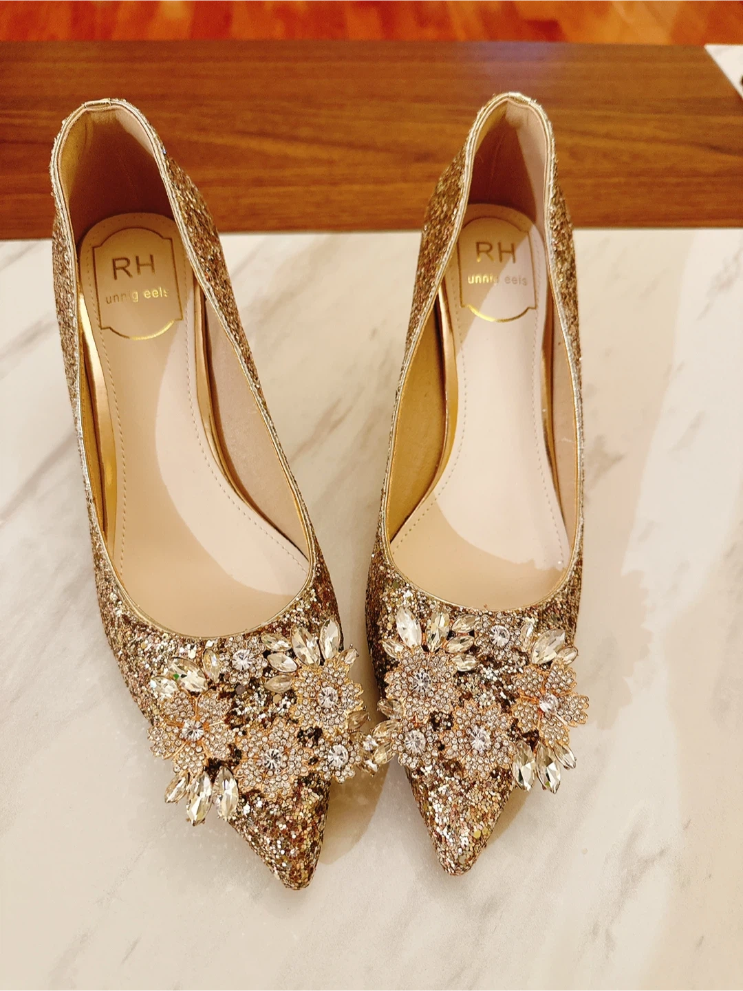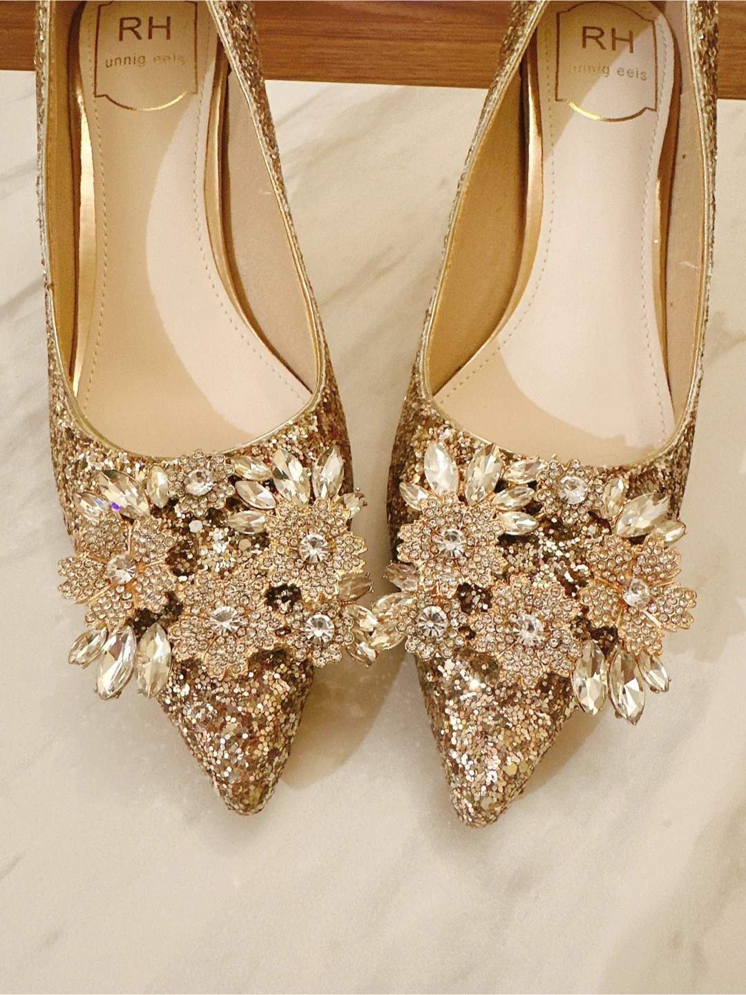 10Brand New Gorgeous gold glitter heels These heels are a size 37 and feature beautiful rhinestone embellishments. Perfect for a special occasion or adding some sparkle to your outfit. heel height: 5 cm