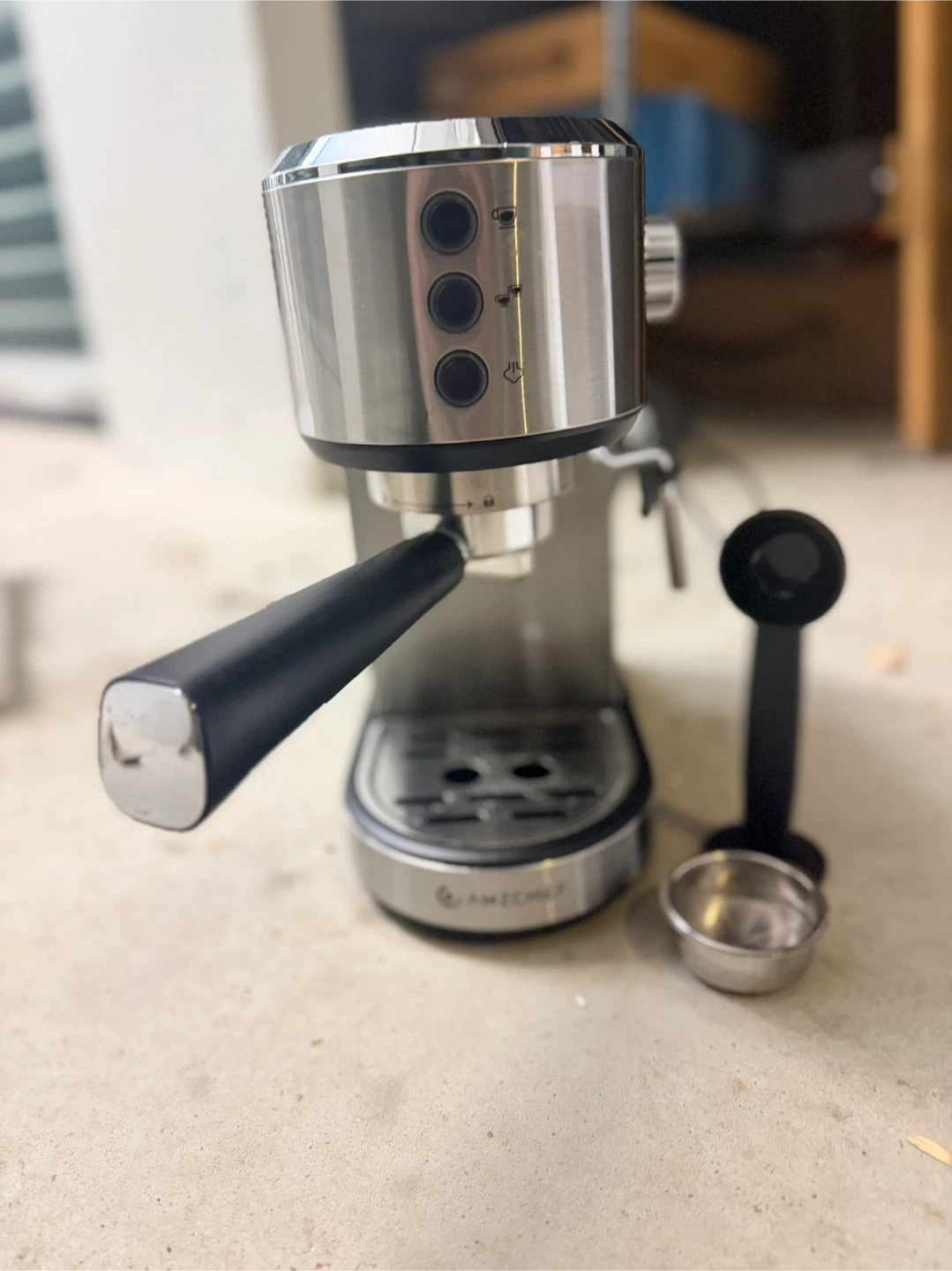 AMZCHEF 1350W espresso machine for sale. It features a powerful 20 Bar professional pump for rich coffee oils. Stainless steel construction with a black handle. Comes with a portafilter and a measuring scoop.