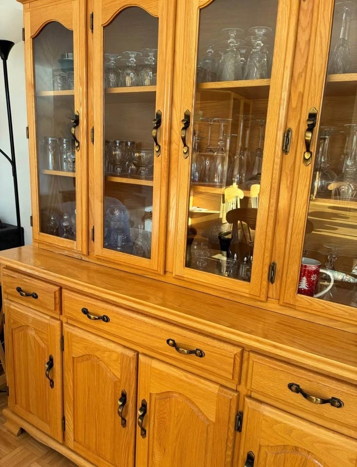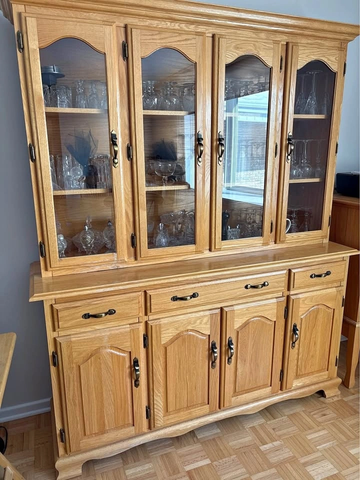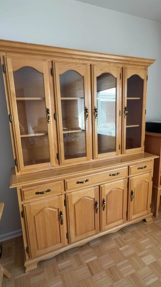 High-quality craftsmanship with a classic, timeless design that adds warmth to any dining space. Solid oak construction throughout. Upper hutch with glass doors and shelving for display. Lower buffet with drawers and cabinets for generous storage. Original hardware, sturdy and well maintained. 73” high (just over 6 ft), 61” long, 18” deep. Elegant, functional, and built to last.