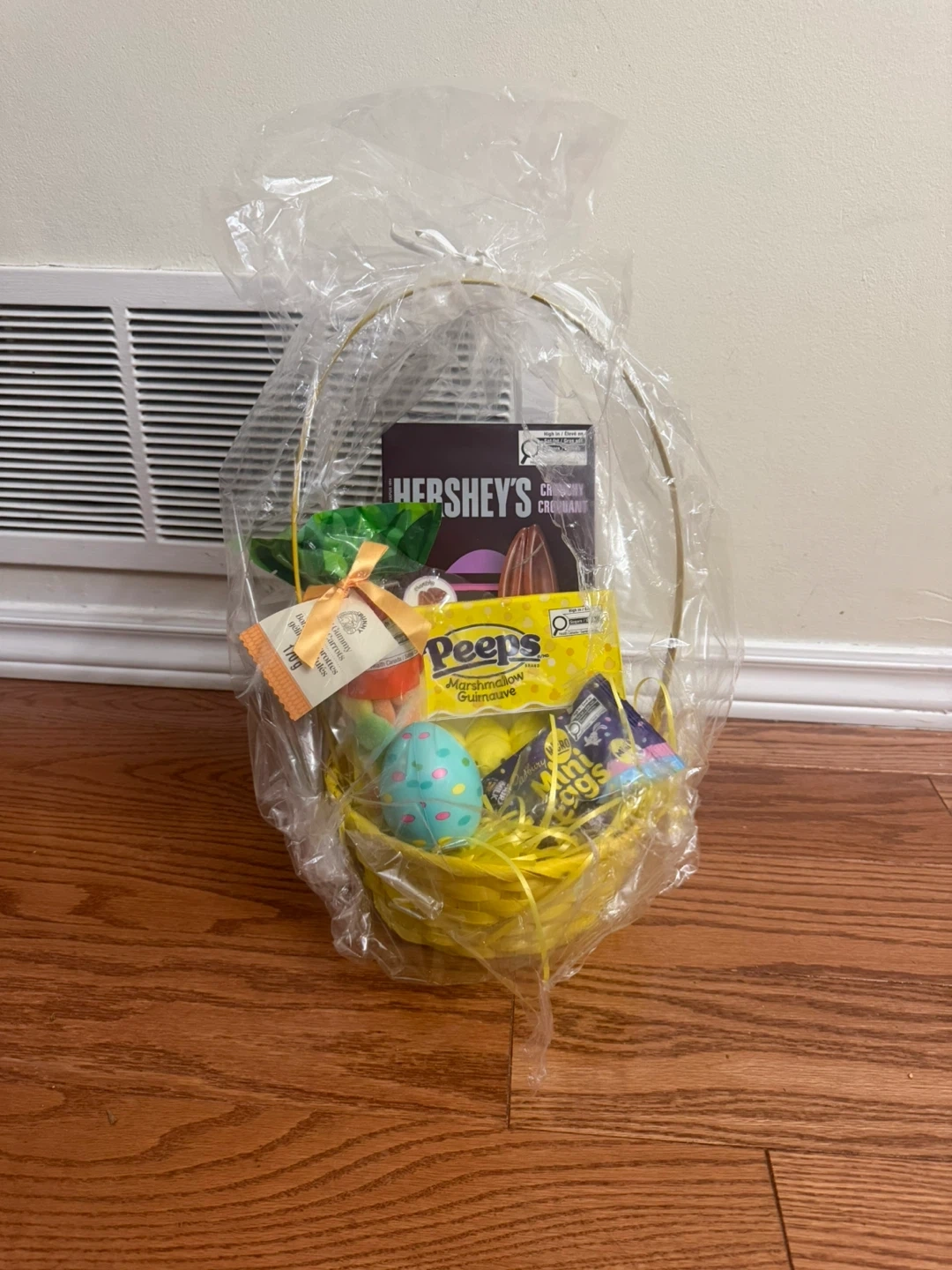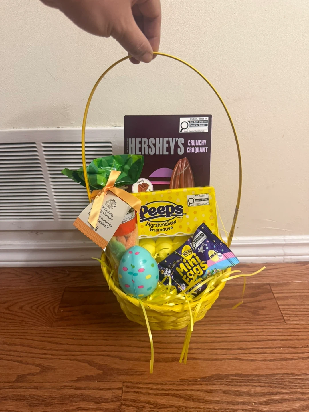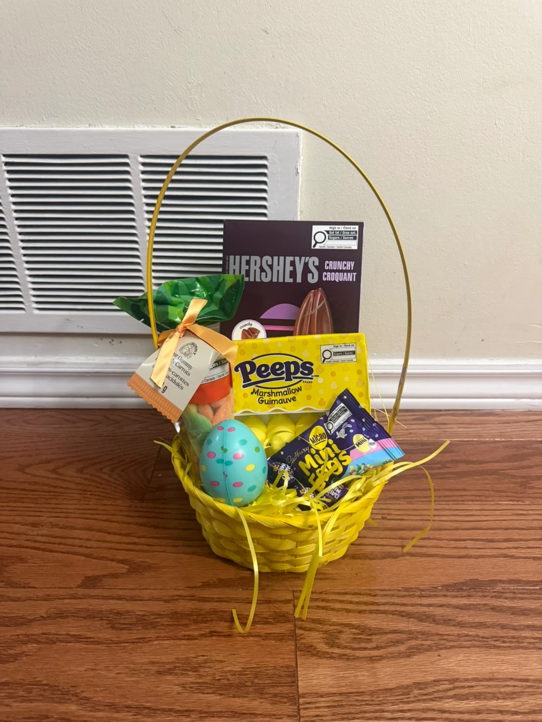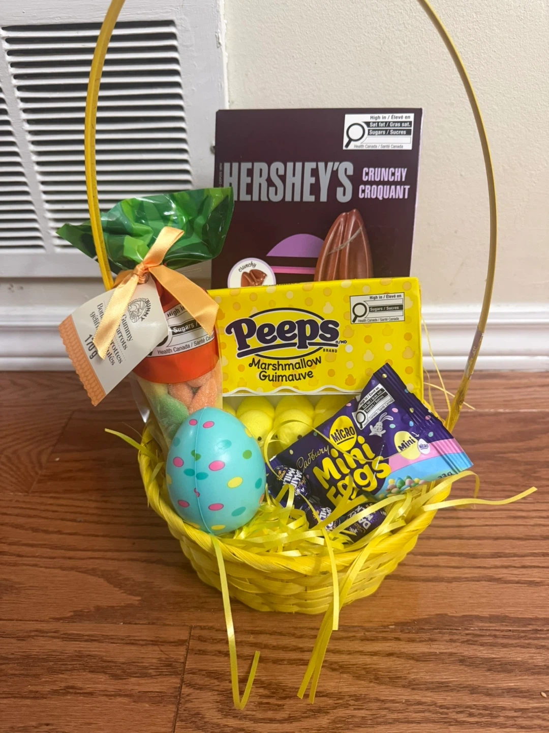 Easter themed treats, Has a Very Big Hersheys chocolate Rabbit, Peeps flavoured Marshmellow, Dairy milk chocolate eggs, Casbury mini eggs, Easter Egg Squeeze Play Toy, Sour Bunny Gummy Candys in a beautiful packaging and basket with confetti