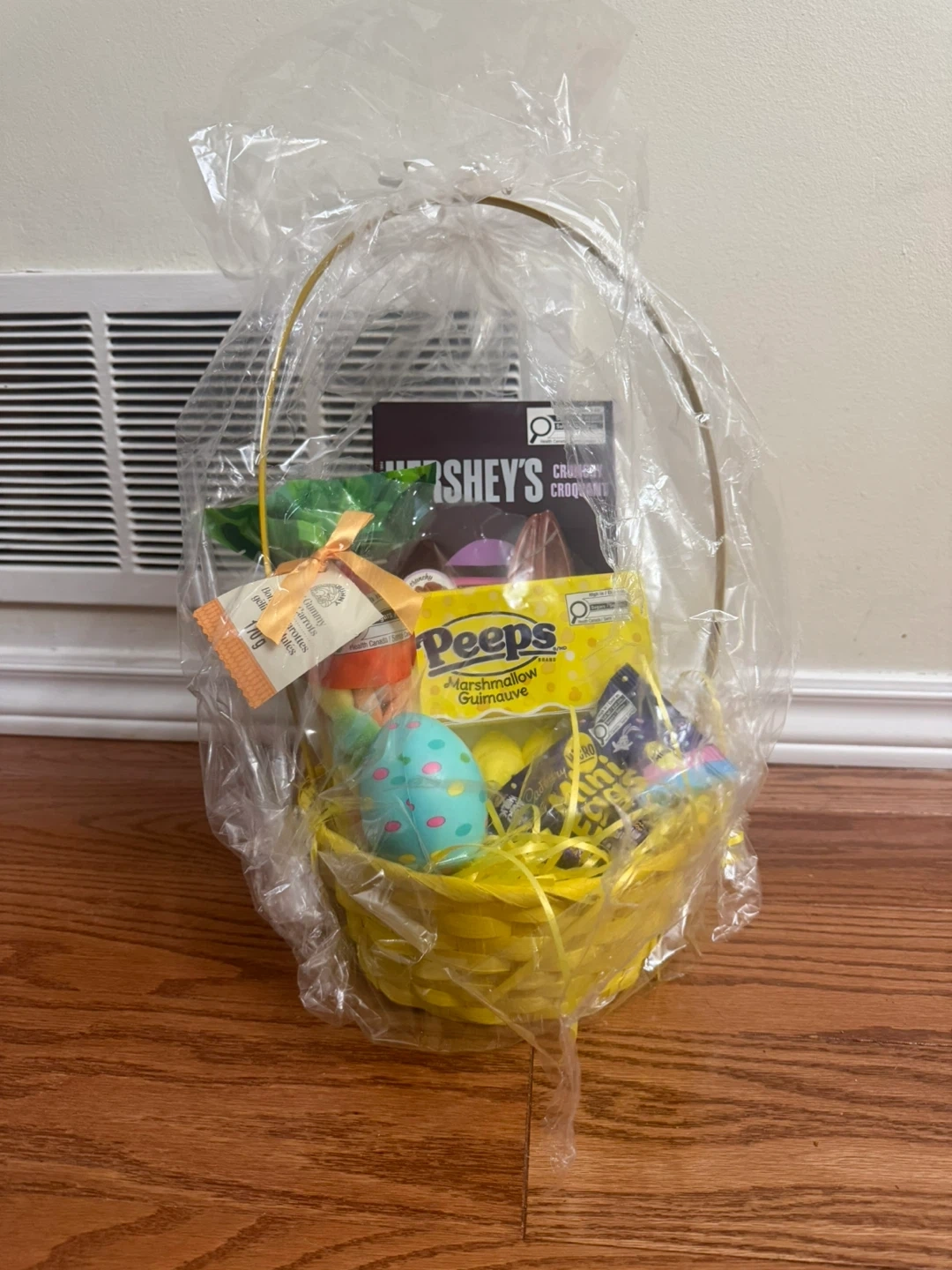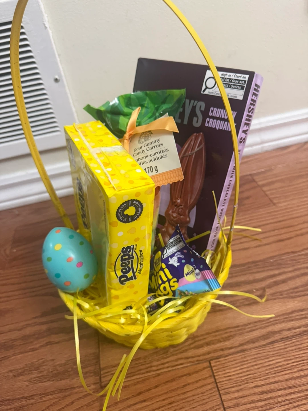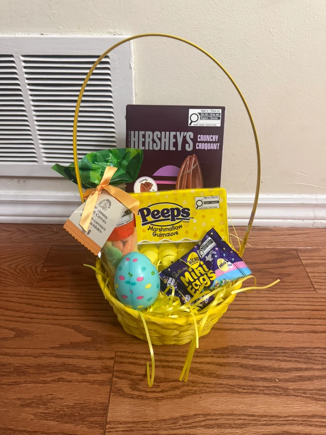 Easter themed treats, Has a Very Big Hersheys chocolate Rabbit, Peeps flavoured Marshmellow, Dairy milk chocolate eggs, Casbury mini eggs, Easter Egg Squeeze Play Toy, Sour Bunny Gummy Candys in a beautiful packaging and basket with confetti
