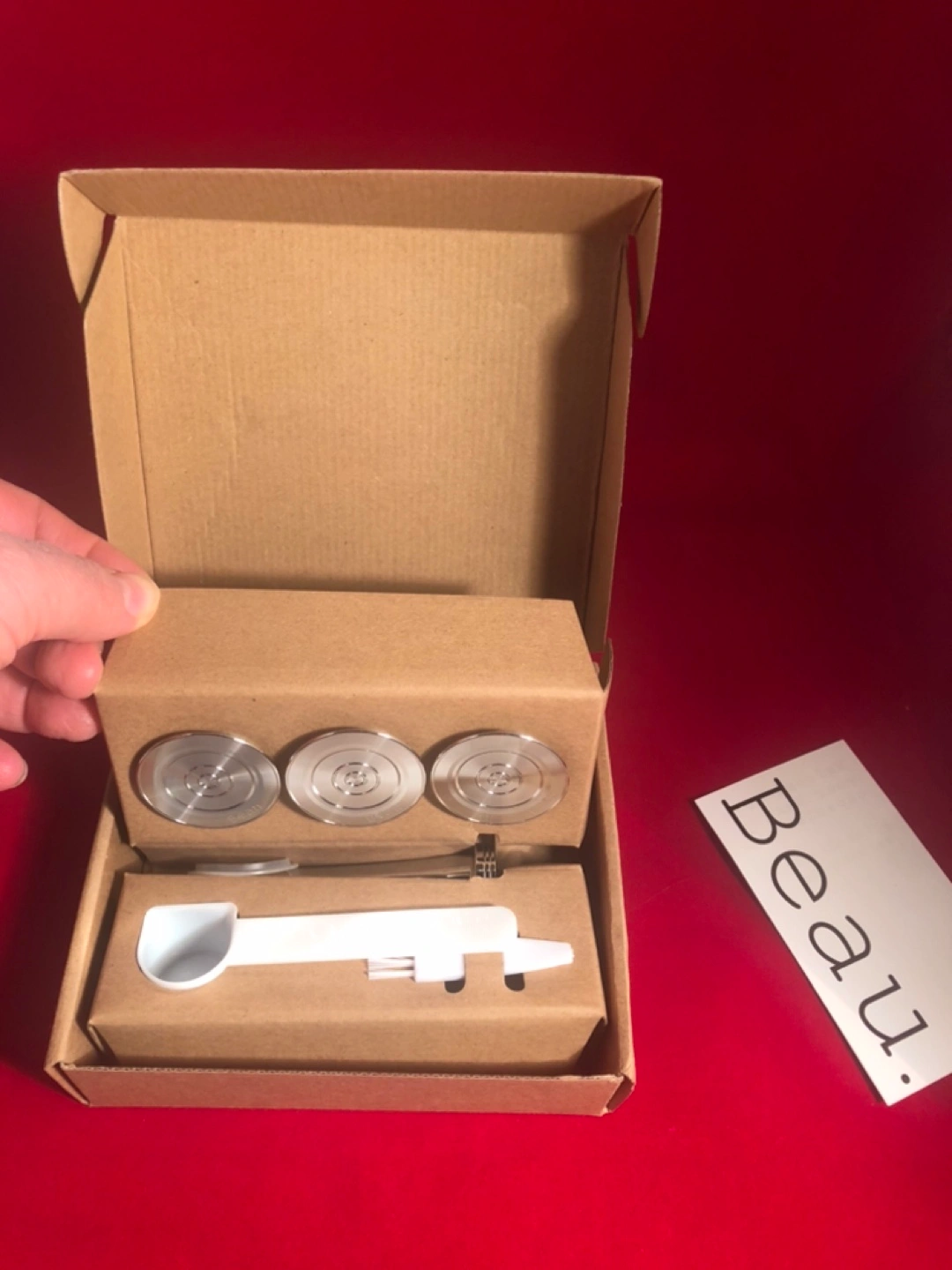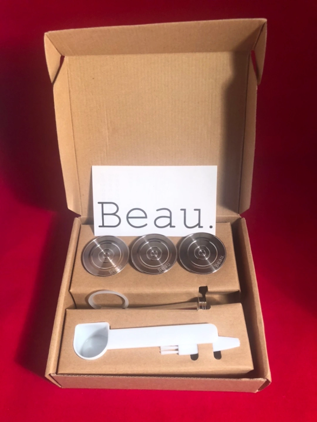 New, genuine unused Beau Nespresso refillable espresso capsules and tamper set in original box. Includes three fillable stainless capsules, a heavy tamper, a scoop, and a distributor tool. All in original packaging - ready to use or to gift to the coffee lover in your life. Ditch the aluminum! See screenshot of my original purchase…this is not a cheap knockoff.