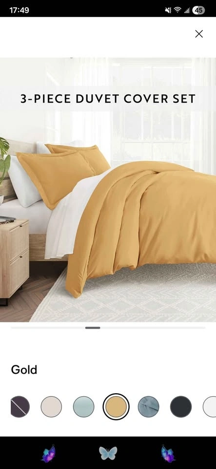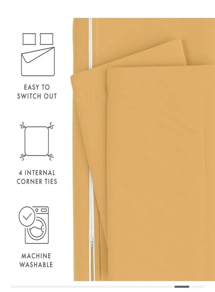 Full/Queen size set includes 1 Duvet Cover (90" x 94") & 2 Pillow Shams (20" x 26" with 2" flange). Made of microfiber. Fade resistant, wrinkle-free, and no ironing needed. Great for sensitive skin. Wicking properties help keep you relaxed and dry. Superior weave for durability and a soft feel. Zippered closure and corner ties inside the duvet cover. Please be aware that the yellow-colored set has some discoloration due to bleach, but only the color is affected, not the fabric itself.