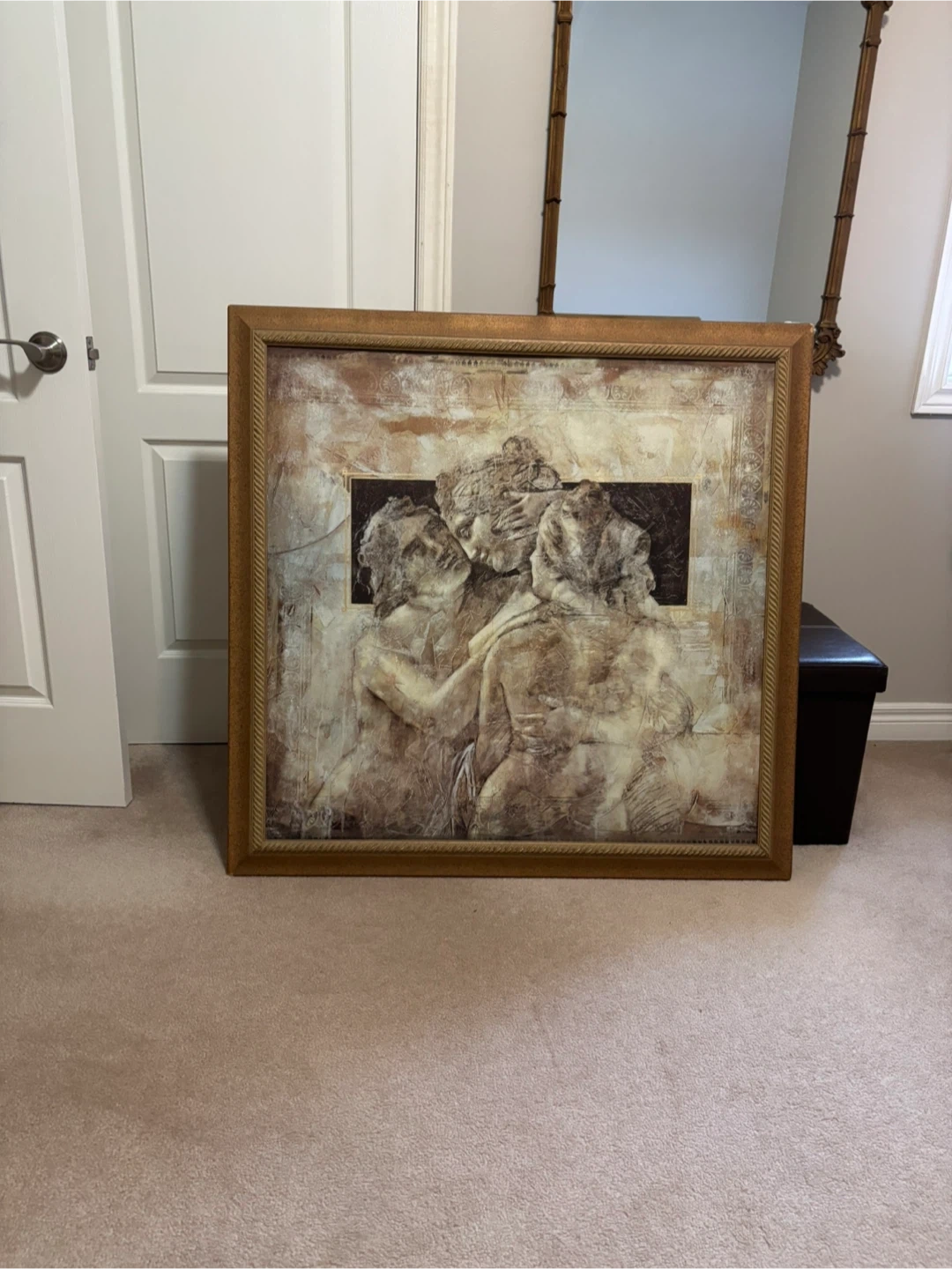 Large framed wall art featuring an abstract depiction of figures. The print has a textured finish and is housed in a gold-toned ornate frame. It's a striking piece that'll add character to any room.