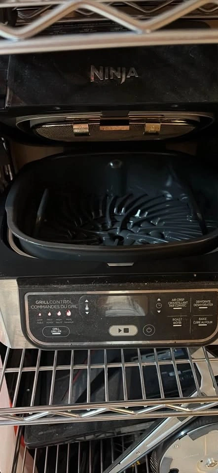 Versatile Ninja Foodi indoor grill in black and stainless steel. Functions include air crisping, roasting, baking, and dehydrating. Unit includes a removable non-stick grill grate and digital control panel.