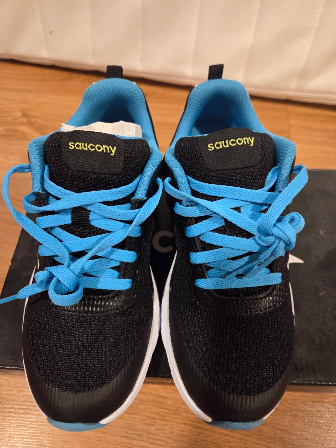Saucony boys running shoes in black, white, and blue. These are size 3 youth. Brand new in box!