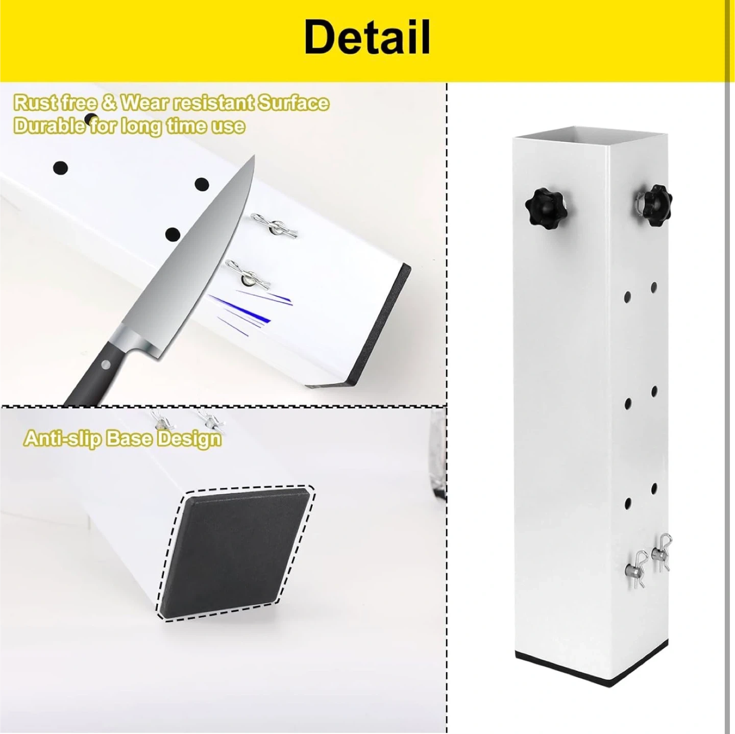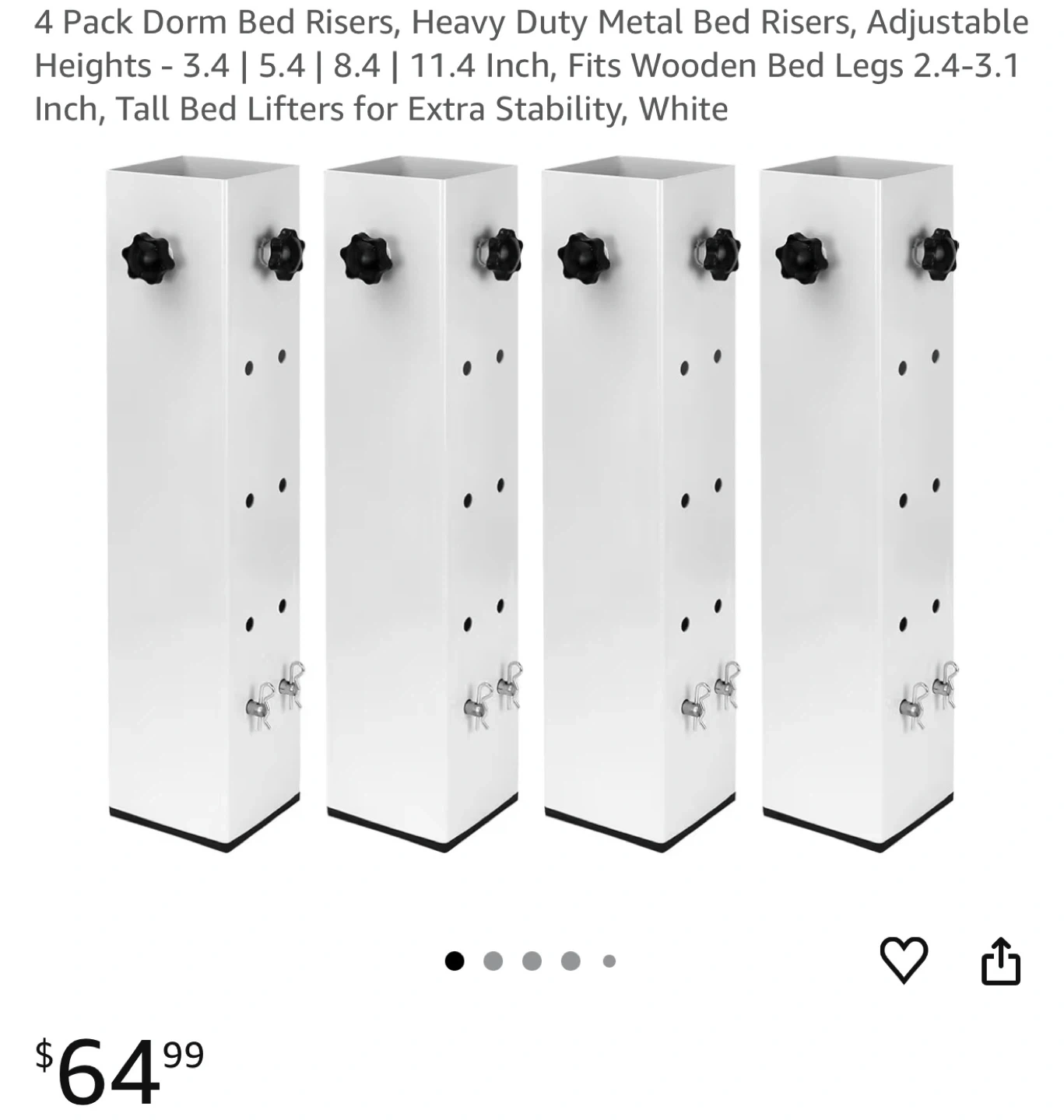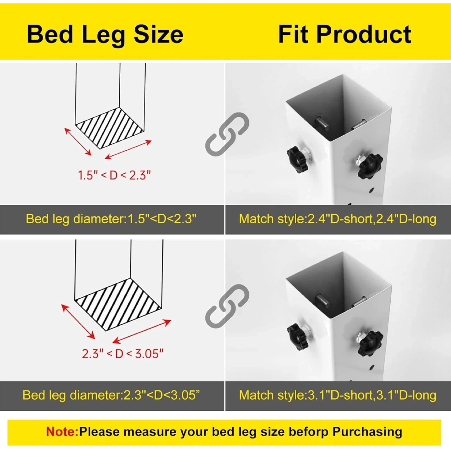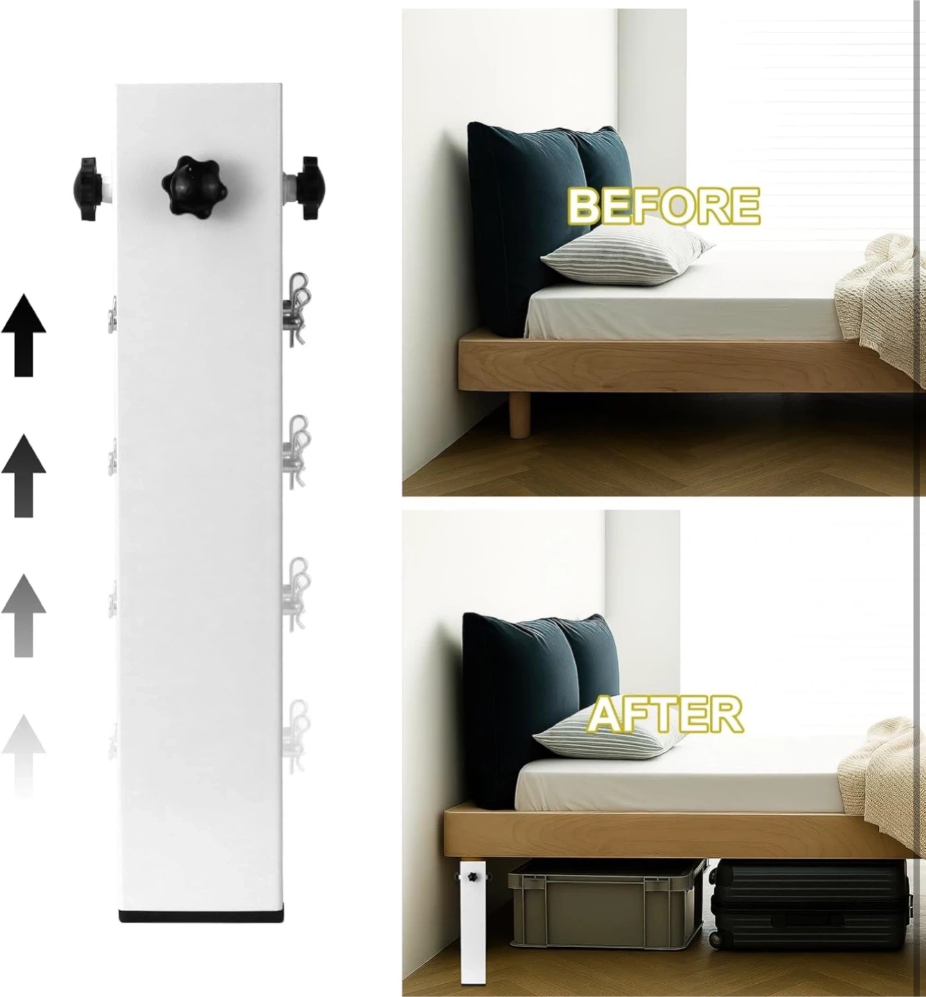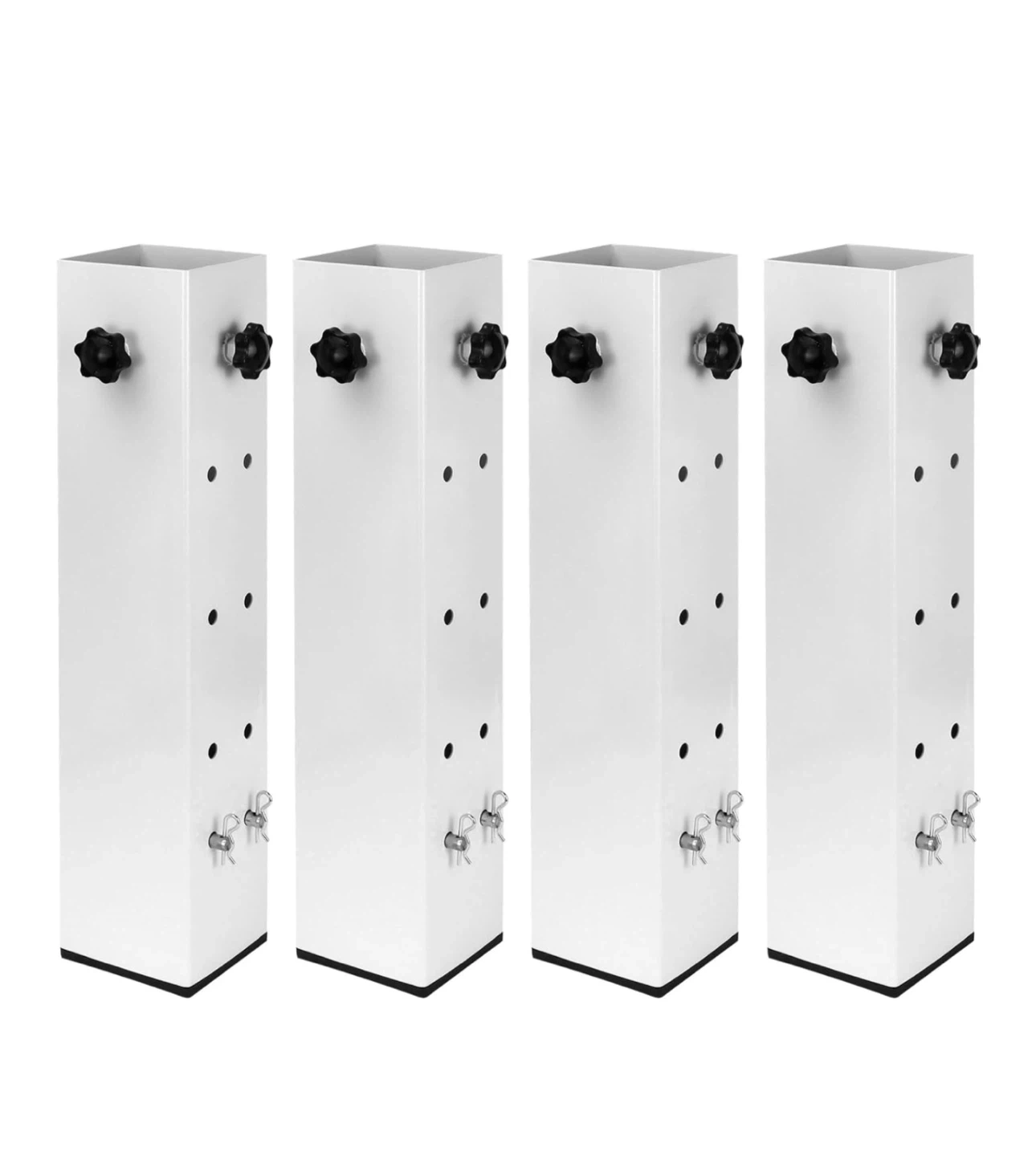 Four adjustable bed legs with a super load-bearing design, supporting up to 9500 lbs. These legs are 40cm/15.74in in height and can fit square, round, or irregular legs with a size of 3.15in or less. The adjustable range for height is 8.7cm/3.42in to 29.2cm/11.49in.