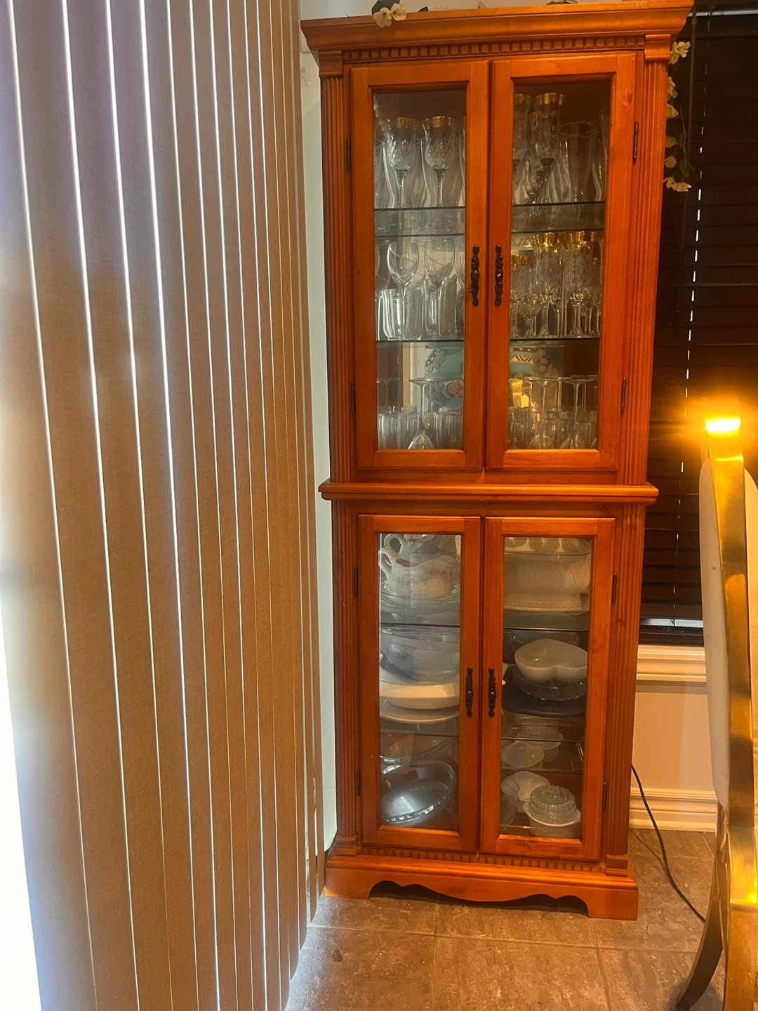 A lovely two-section china cabinet with glass doors, perfect for displaying your dishes and glassware. It's made of wood and features adjustable glass shelves.