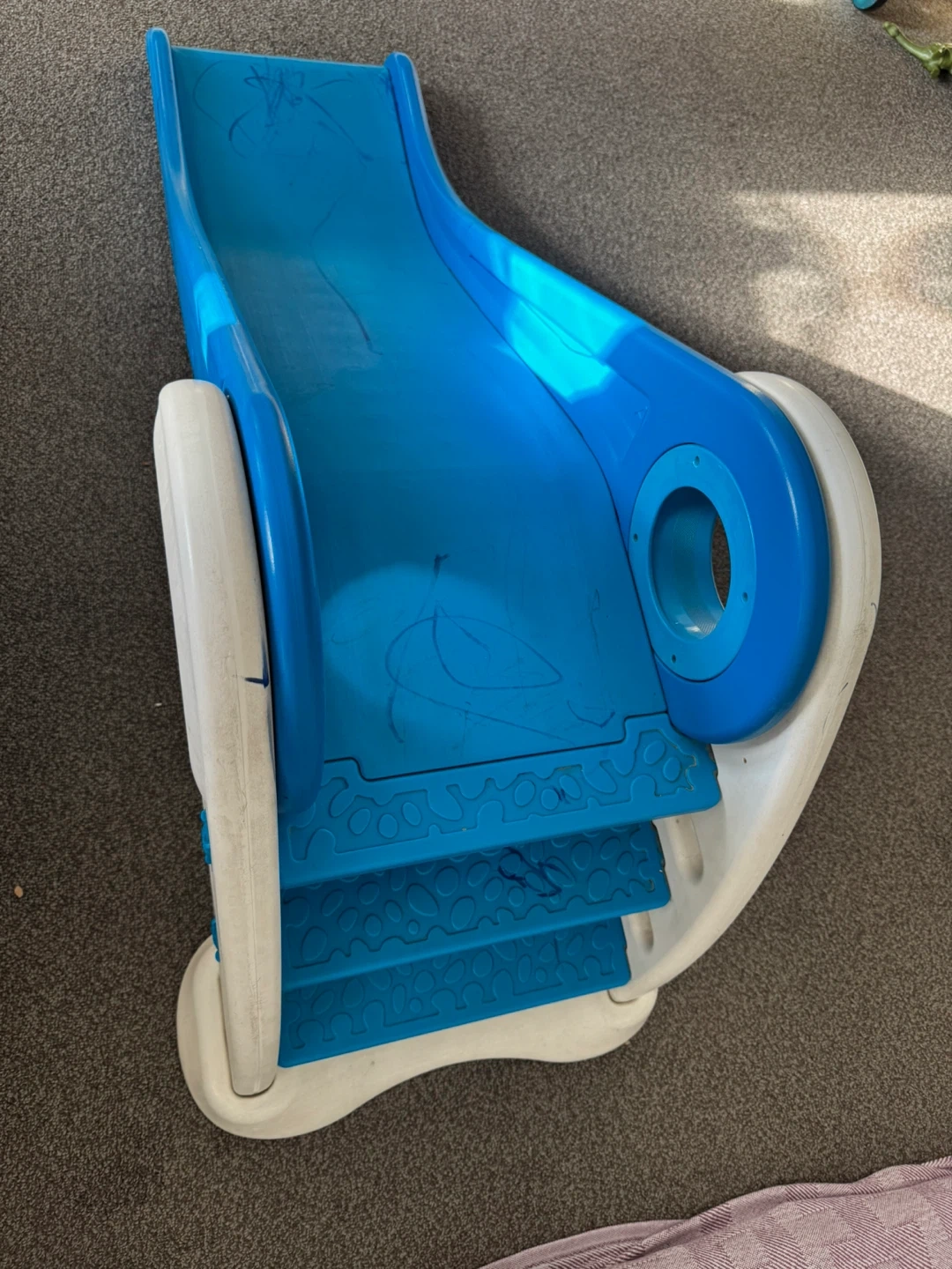 A fun blue plastic slide for kids. It's great for indoor or outdoor play. Features easy-grip handles and a gentle slope for safe sliding. Perfect for toddlers and young children!