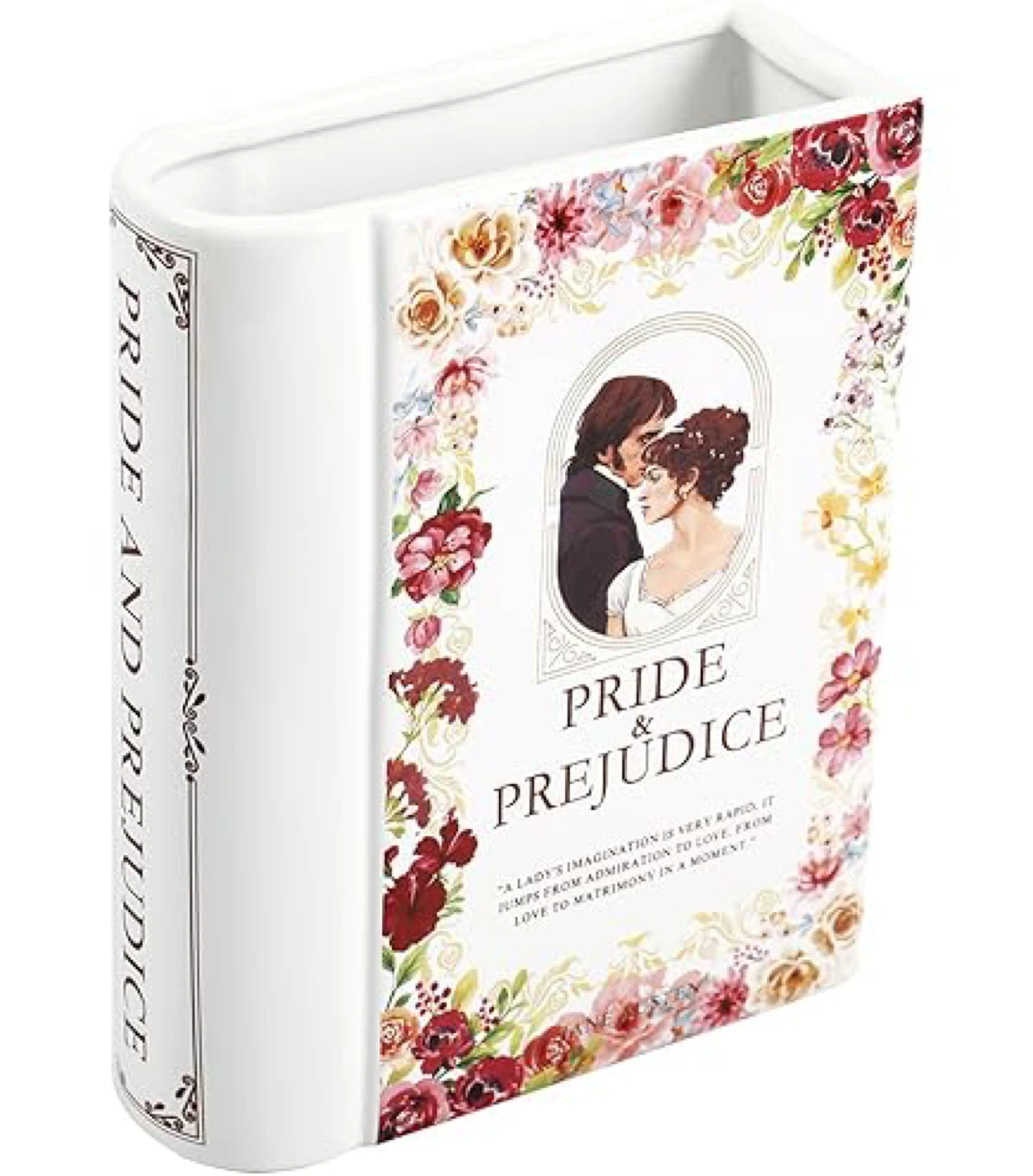 This decorative vase is designed to look like a classic book, featuring the "Pride and Prejudice" cover art. It's made of ceramic and measures 7.9 inches tall by 5.9 inches wide. This piece would add a literary touch to any room!