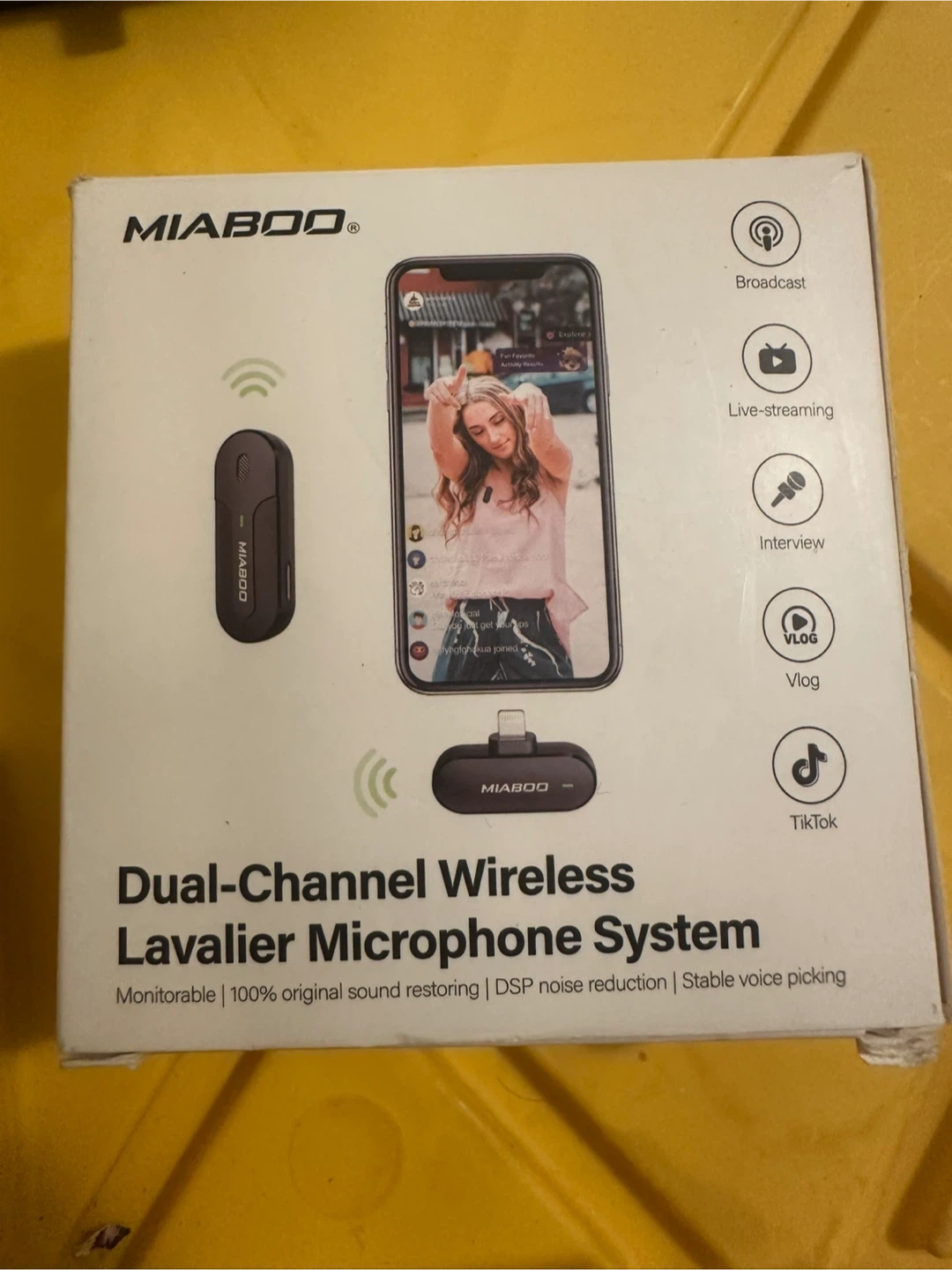 This MIABOD M26 system includes a dual-channel wireless lavalier microphone designed for Lightning devices. It offers 100% original sound restoring and DSP noise reduction. The system is suitable for broadcast, live-streaming, interviews, vlogging, and TikTok.