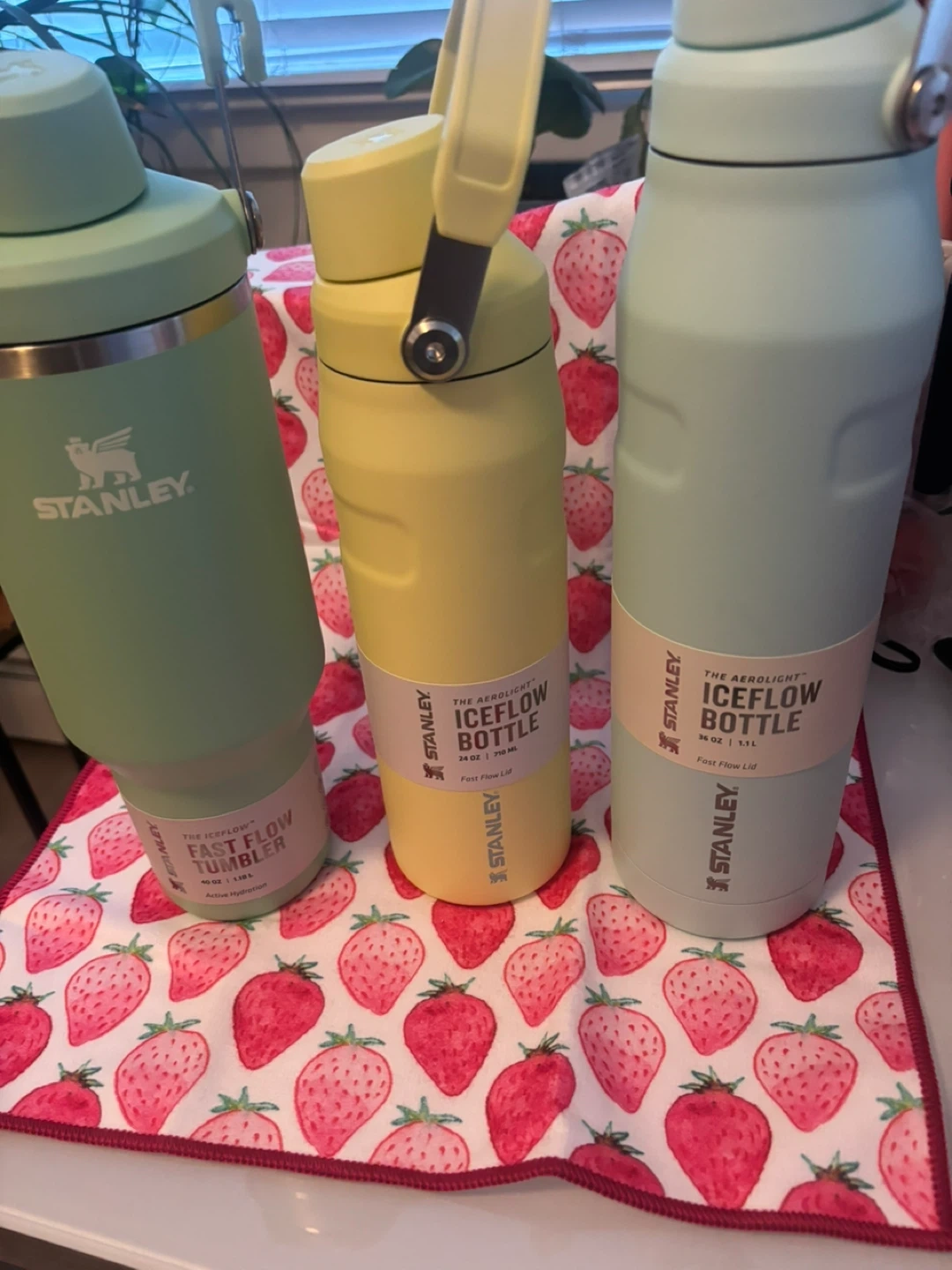 Set includes a 40 oz Stanley IceFlow Fast Flow Tumbler and two Stanley Aerolight IceFlow Bottles, one 24 oz and one 36 oz. Bottles feature Fast Flow Lids. All are in great condition.