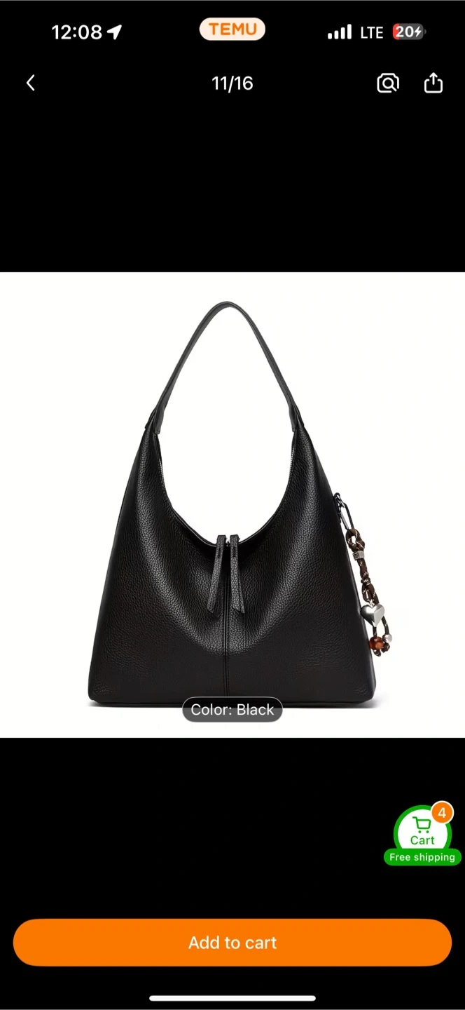 This is a black shoulder bag with a pebbled texture. It has a unique slouchy shape and a decorative tassel detail at the front closure. A charming heart charm accent hangs from the strap.