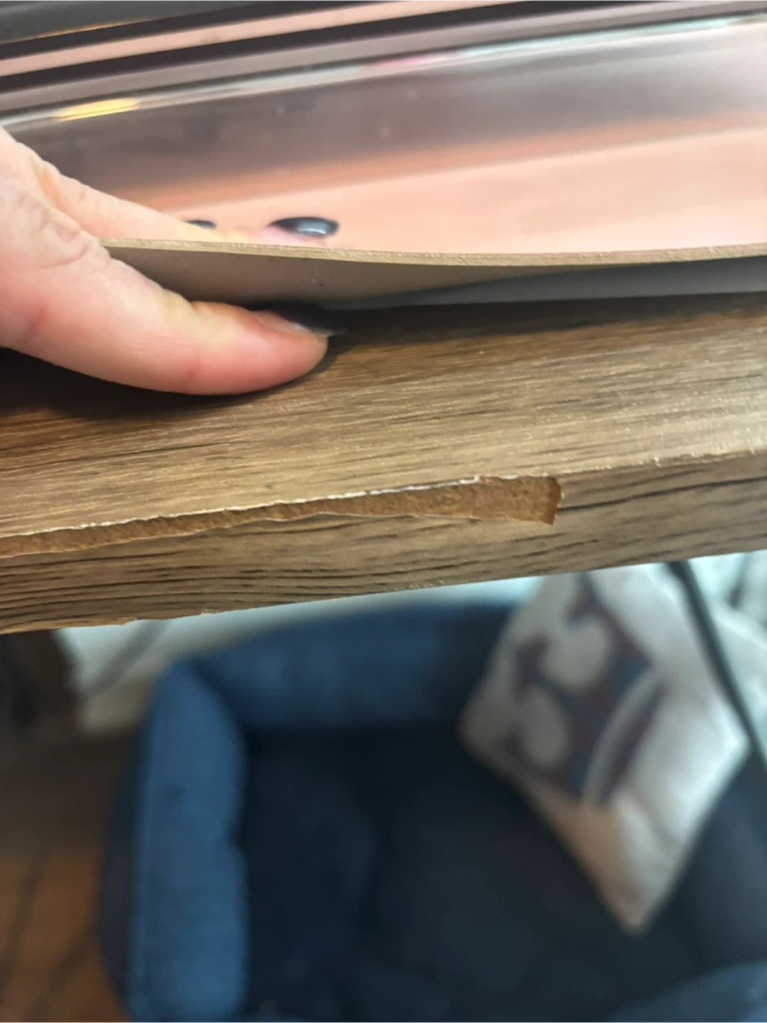 This desk features a rustic wood grain laminate top and sturdy black metal hairpin legs. It's a great size for a small workspace or study area. Some minor wear is visible on the edge of the desk top.