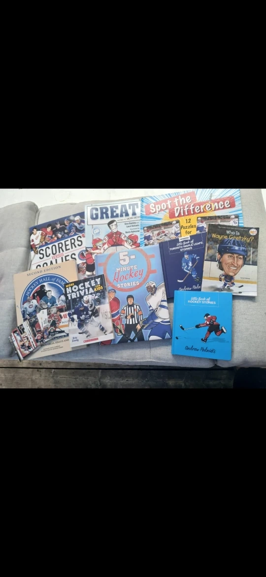 Selling a collection of hockey books! Includes titles like 'Scorers Versus Goalies', 'Great Hockey Stories', 'Spot the Difference', '5-Minute Hockey Stories', 'Hockey Trivia for Kids', and 'Who Is Wayne Gretzky?' Perfect for young hockey fans!
