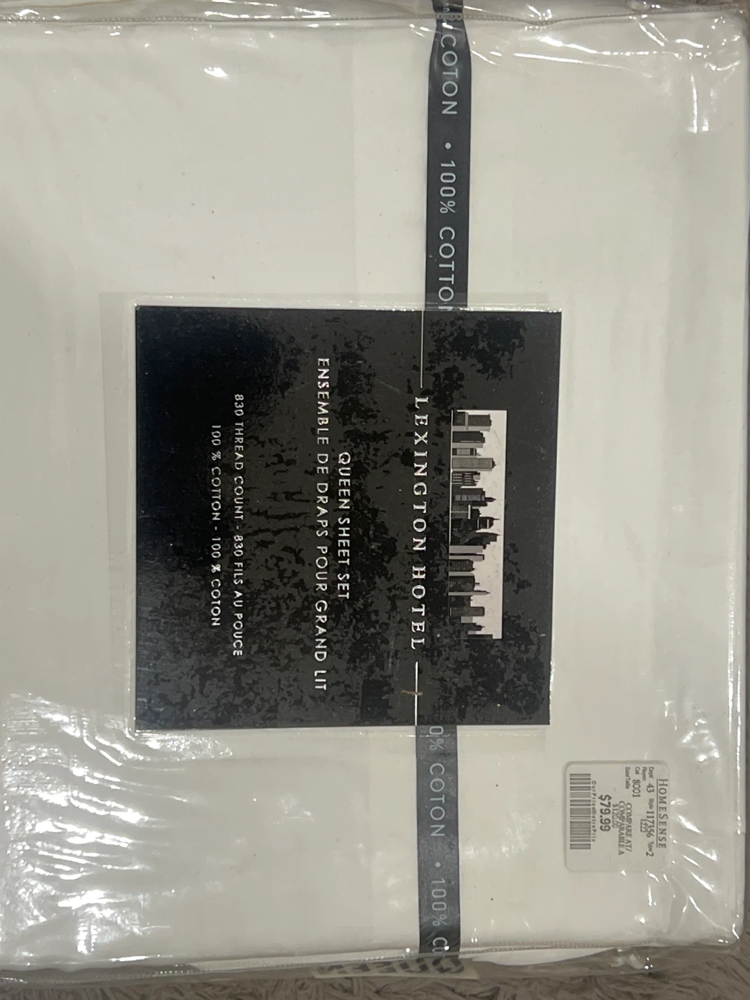 Brand new queen sheet set from Lexington Hotel. It's made with 100% cotton and features an 830 thread count. The set is white and comes in its original packaging.