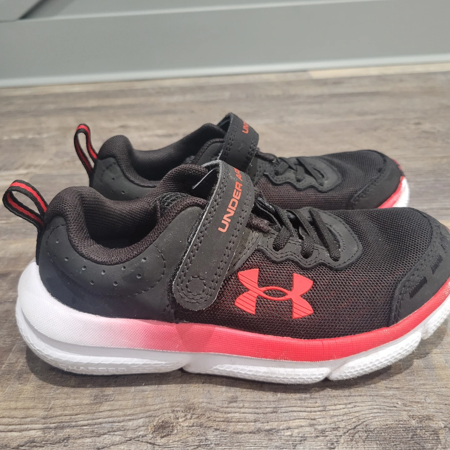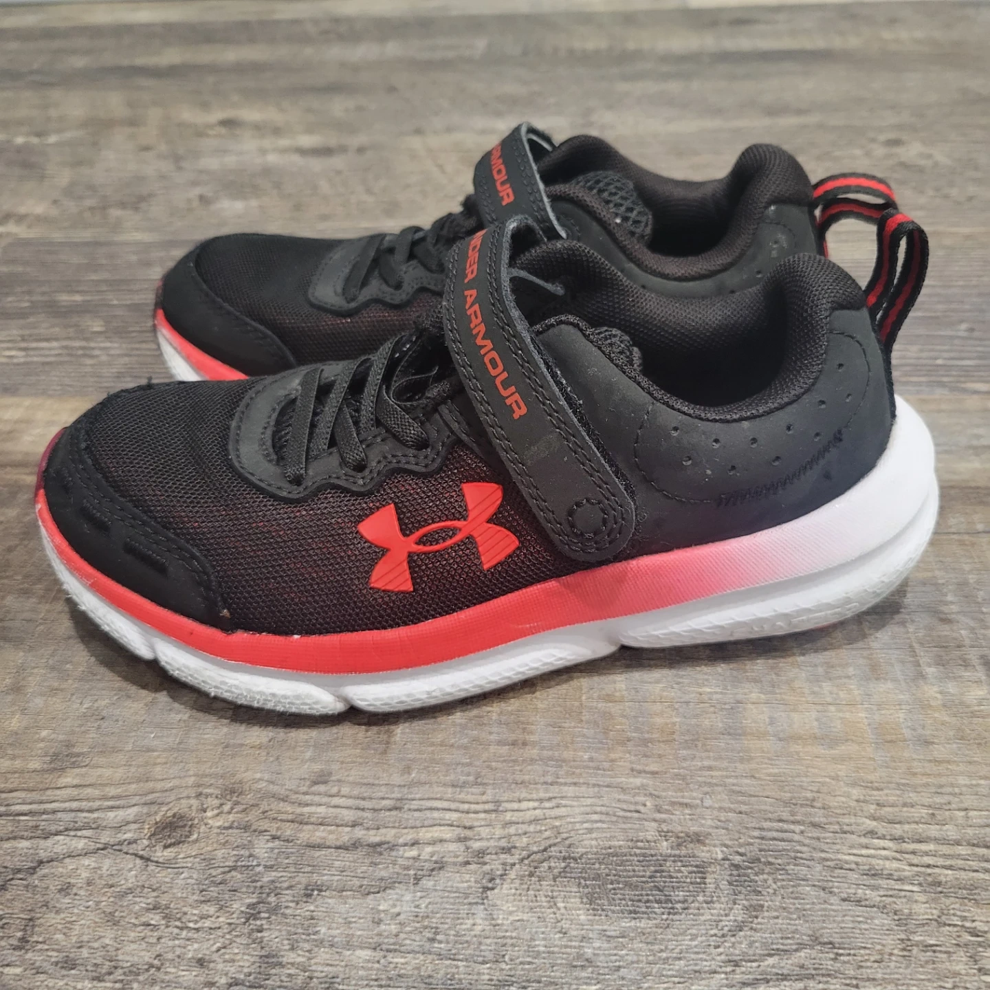 These black Under Armour running shoes feature a red and white sole with velcro straps for easy fastening. The mesh upper provides breathability, and the rubber outsole offers good traction. These are kids' shoes with a sporty design. Used for indoor only.